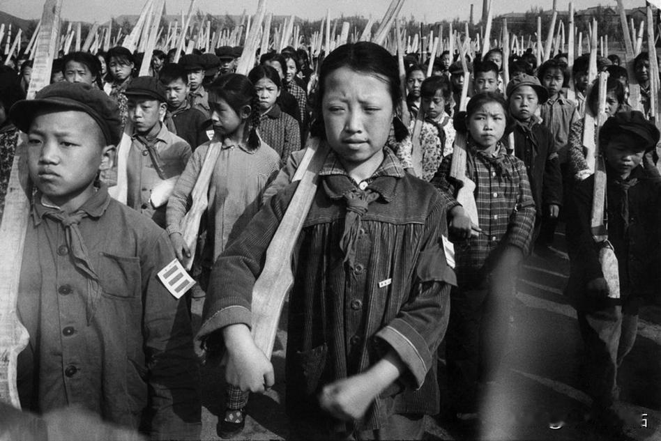 这张照片拍摄于1965年,辽宁沈阳,一群少先队员参加游行。 孩子们大多为小学生年龄,男生多戴帽子、穿对襟衫或夹克,女生扎辫子、穿朴素上衣,许多人胸前佩戴红领巾。队伍整齐前行,每人肩扛一根木制枪。 1964年全军大比武后,军事训练延伸到民间和学校,少先队员常进行基本队列、刺杀操等活动,以培养纪律性和国防意识。木枪作为安全、经济的训练工具,广泛用于儿童和民兵训练。