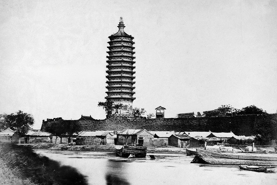 这张照片是北京通州燃灯塔,是1860年第二次鸦片战争期间,由英军随军摄影师费利斯·比托拍摄的,也是通州地区现存最早的影像资料之一。 通州燃灯塔全称“燃灯佛舍利塔”,是大运河北端的标志建筑,与临清舍利宝塔、扬州文峰塔、杭州六和塔并称为“运河四大名塔”,有“一枝塔影认通州”的说法。 燃灯塔始建于北周(约公元557年),距今超1400年,是北京地区较古老的建筑之一;历代屡毁屡修,照片拍摄时(1860年)的塔身状态,也保留了清末的样貌。 当时塔顶上已有一棵“塔榆”(1697年生于塔顶瓦垄间),这棵树在塔顶存活近300年,后来在1987年被迁移到地面。
