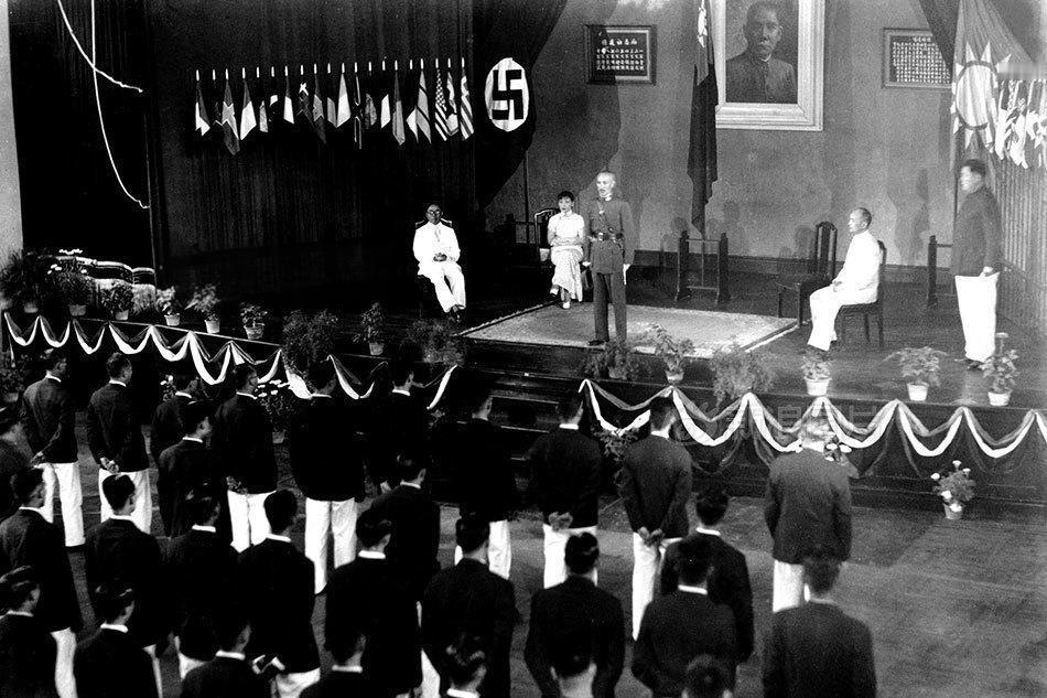 这张照片拍摄于1936年6月,中国国民政府领袖蒋介石在南京接见即将赴德国柏林参加第11届奥运会的中国体育代表团,并向运动员们发表讲话。 照片中,舞台悬挂多国旗帜,包括美国、法国等国旗,以及当时的德国国旗(黑白红三色旗中间带有卐字的纳粹党徽旗)。出现在这里的原因,是当时中德关系密切,1930年代中期,纳粹德国与中华民国政府开展广泛的军事、经济和技术合作。德国向中国提供军事顾问、武器装备和工业援助,帮助蒋介石训练军队、现代化国防,以换取中国原材料(如钨、锑)。 这次中国派出69名运动员参加多项赛事(虽未获奖牌,但武术表演队等深受欢迎),并有体育考察团同行。代表团经费紧张,德国方面还资助了部分开幕式服装和团徽。