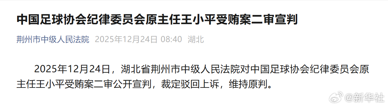 #足协纪律委员会原主任王小平受贿案二审宣判#【中国足球协会纪律委员会原主任#王小平受贿案二审宣判#】2025年12月24日,湖北省荆州市中级人民法院对中国足球协会纪律委员会原主任王小平受贿案二审公开宣判,裁定驳回上诉,维持原判。(荆州市中级人民法院)