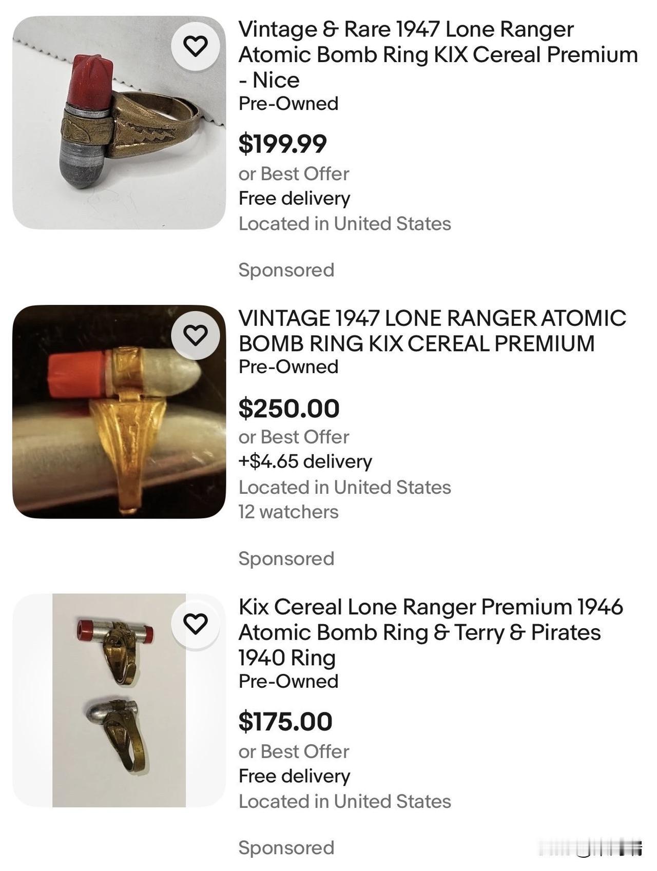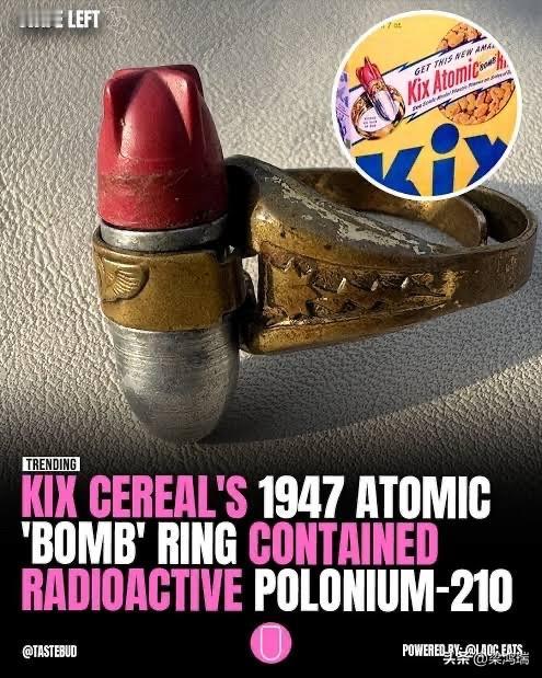 历史上最危险的促销活动之一竟然来自儿童麦片的促销礼品。1947年,Kix麦片推出了一款名为“原子弹戒指”的玩具,售价仅为15美分和一个盒盖。令人震惊的是,这款玩具竟然含有钋-210,这是人类已知最致命的放射性物质之一。 这个物品是 Kix 麦片“独行侠”原子弹戒指(Lone Ranger Atomic Bomb Ring),由通用磨坊(General Mills)于 1947 年作为麦片促销赠品推出。 戒指详情 设计: 戒指有一个可调节的金色指环,顶部装饰着一个带有可拆卸红色塑料尾翼的铝制微型“炸弹”。尾翼也是一个隐藏式信息隔层。 拆下红色底座后,戒指就变成了一个微型闪烁镜(spinthariscope)。在黑暗的房间里看透小镜头,可以看到由钋-210(Polonium-210)释放的阿尔法粒子撞击硫化锌屏幕产生的闪光。 当时被宣传为“完全安全”,因为阿尔法粒子无法穿透皮肤。然而,钋-210 是已知最致命的放射性同位素之一,如果被吸入或摄入则极其危险。 如今,这些戒指被视为冷战时期的收藏品和博物馆展品。由于钋-210 的半衰期仅约 138 天,现存的任何戒指中的放射性物质早已完全衰变,不再具有放射性或发光能力。 这次促销活动反映了二战后美国社会对原子能的痴迷与无知,当时“放射性”被视为进步和现代的象征,而非危险。如今,将放射性物质放入儿童玩具中是不可想象的,这枚戒指成为了那个年代宽松安全标准的一个惊人提醒。