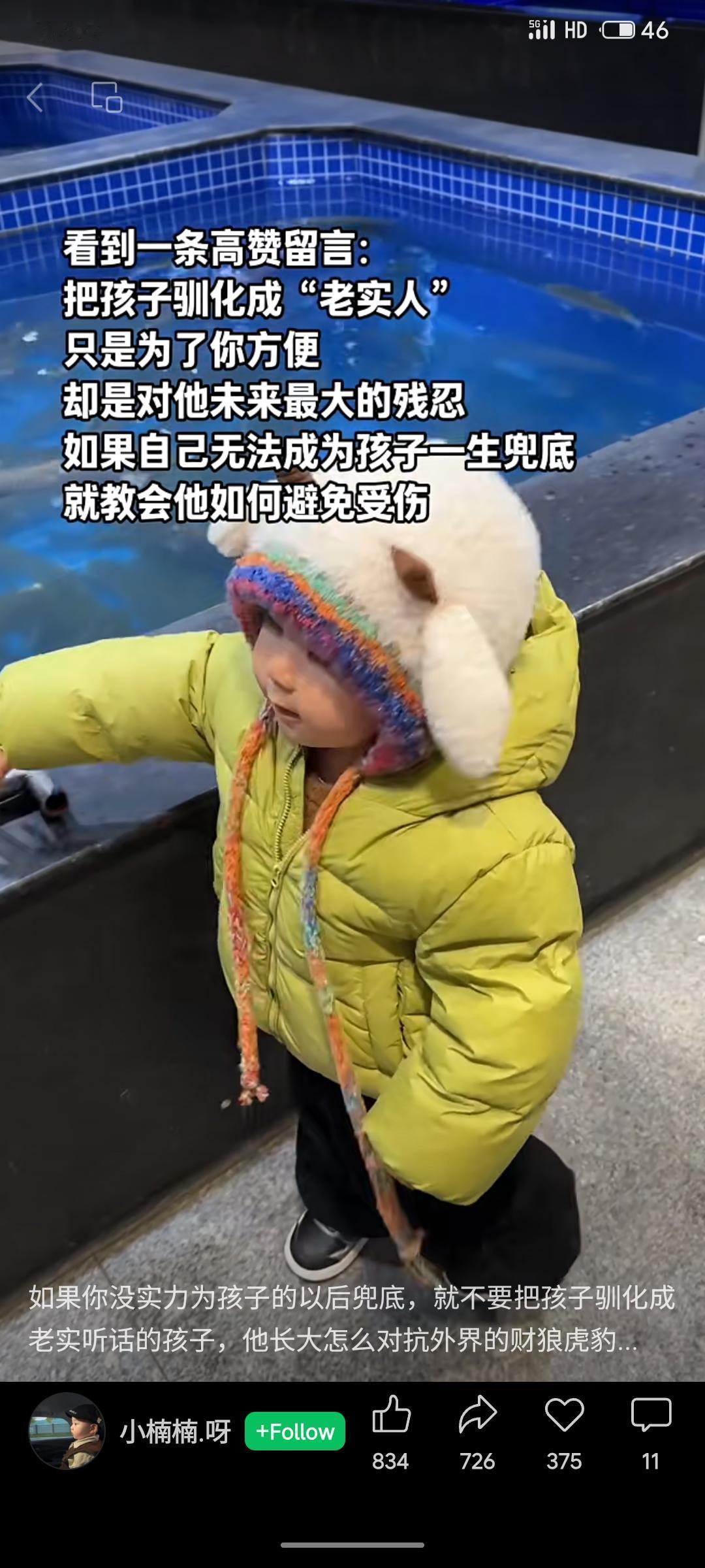 引用一条高赞留言,批评将孩子教育成“老实人”只是为了家长方便,却可能让孩子在未来社会中处于弱势。强调若无法为孩子一生兜底,就应教会其自我保护,而非单纯要求听话。