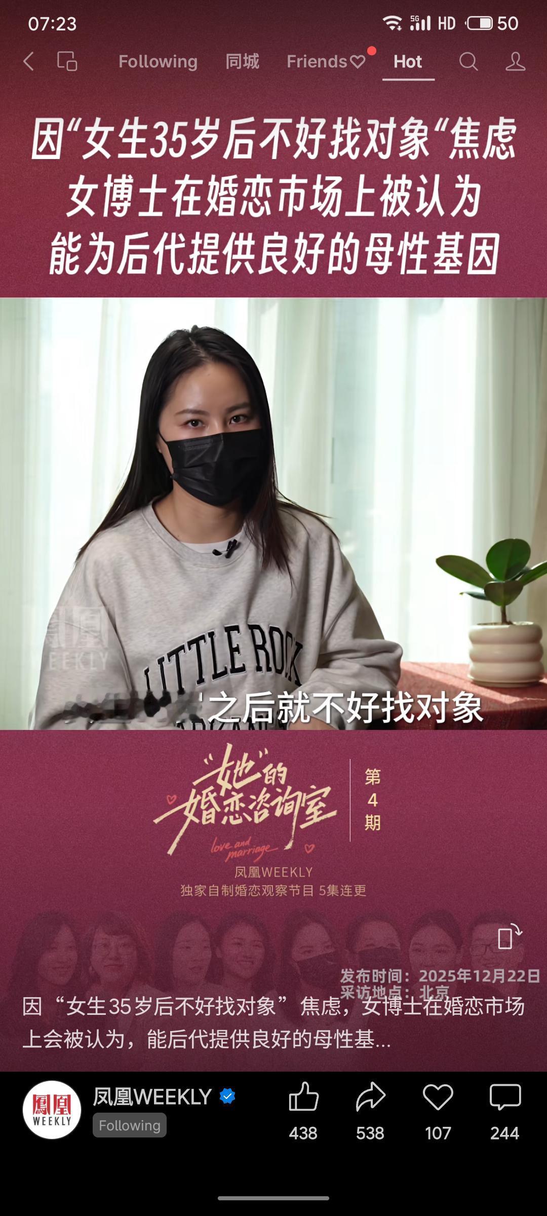 凤凰周刊一档婚恋观察节目探讨了社会对女性年龄的焦虑,指出“女生35岁后不好找对象”的现象,并提及女博士在婚恋市场中被认为能提供良好母性基因的认知。