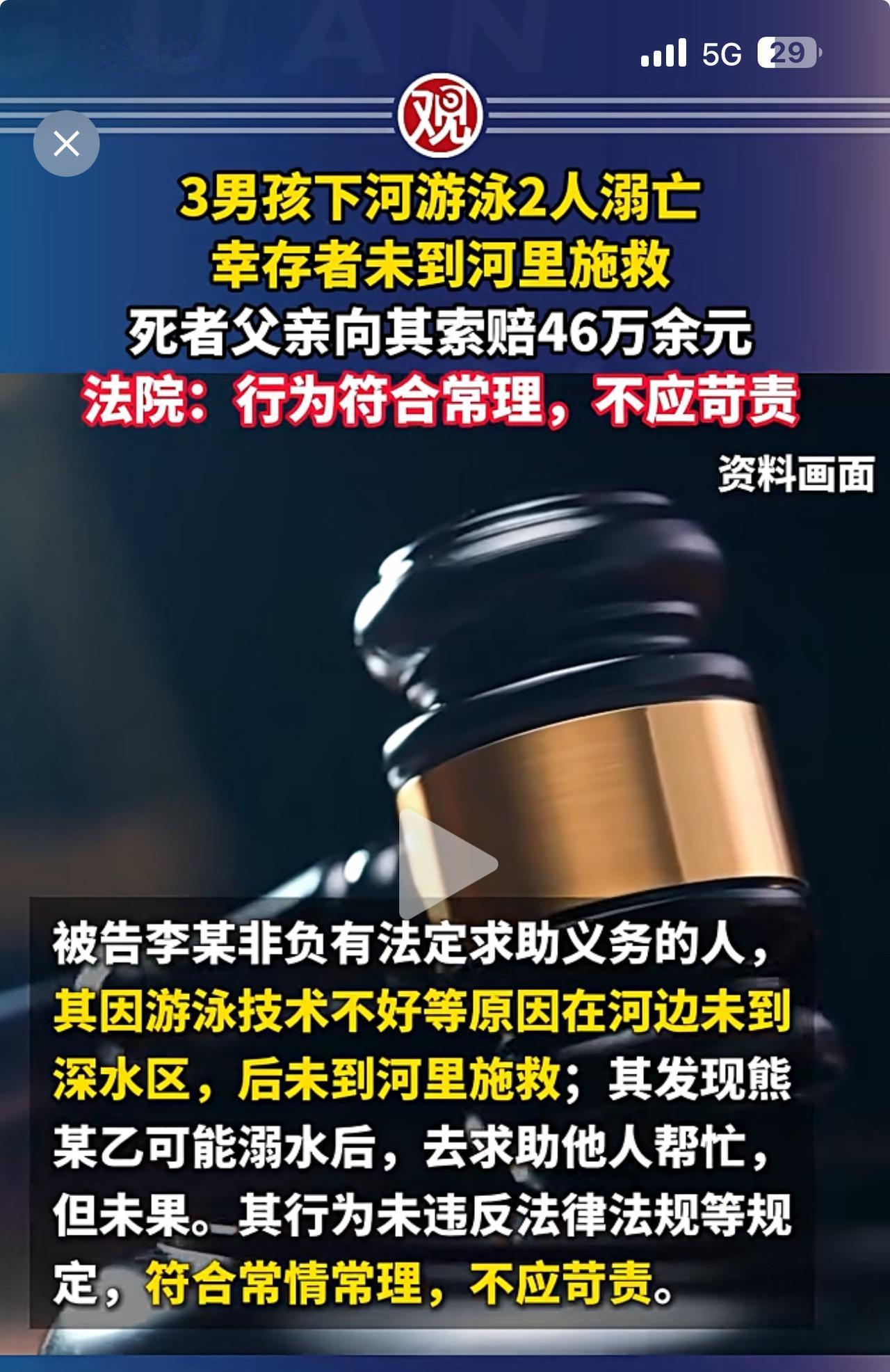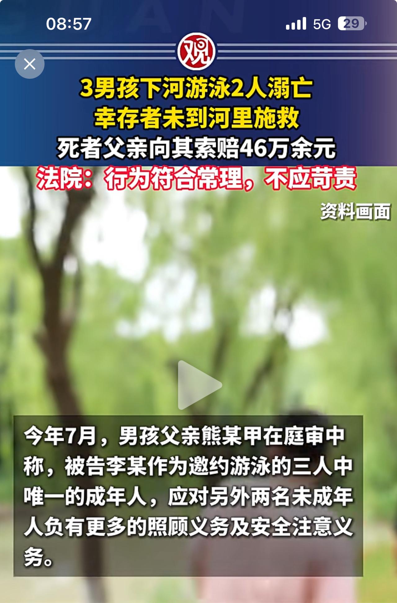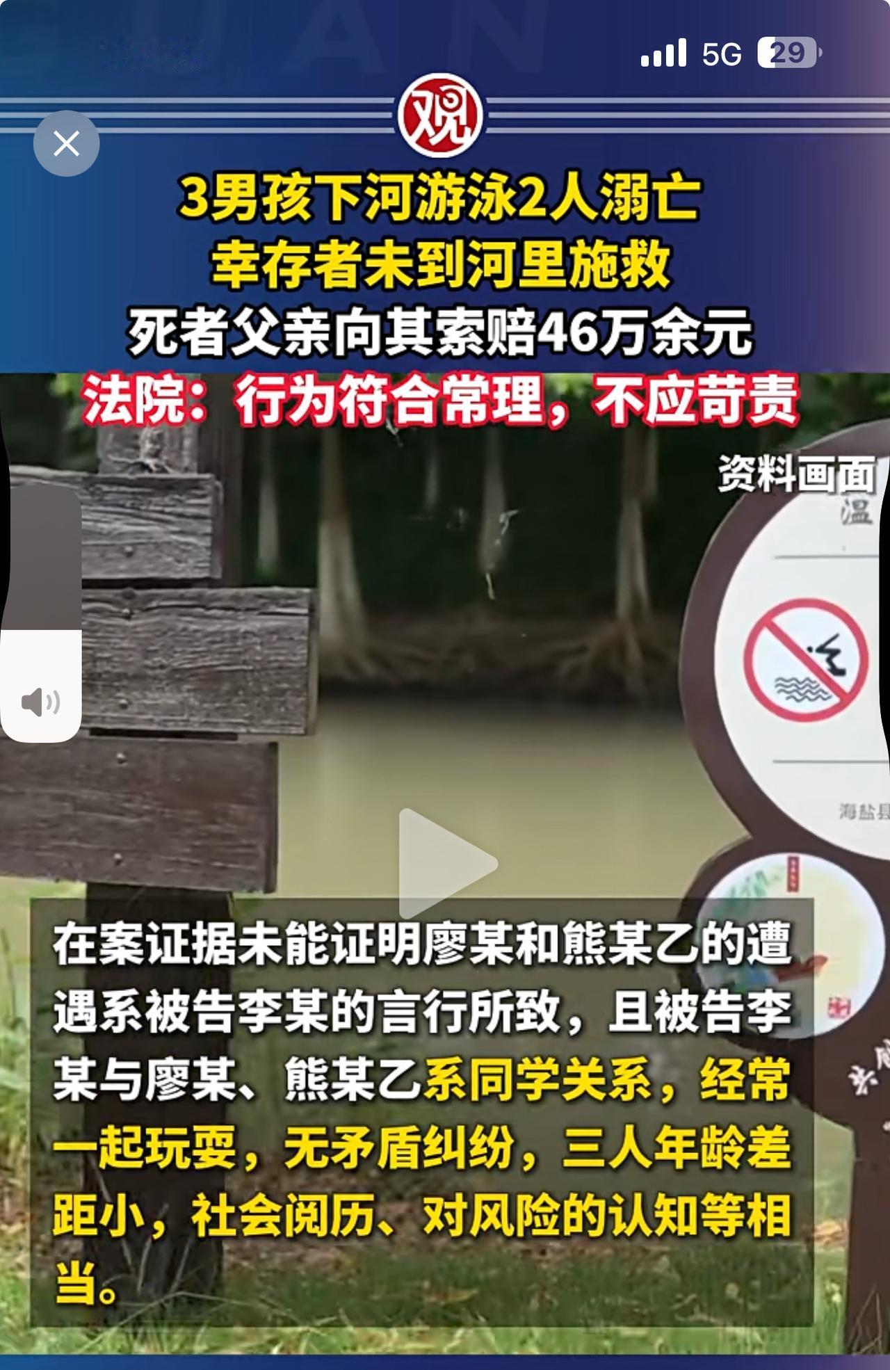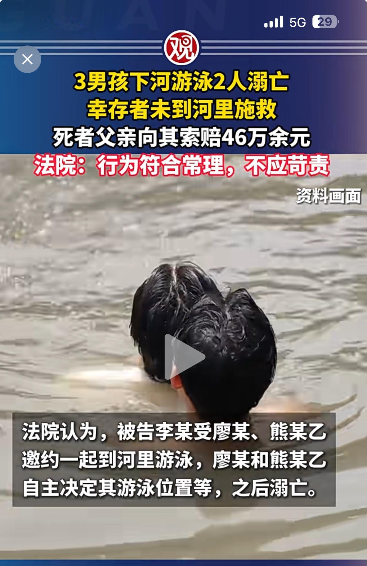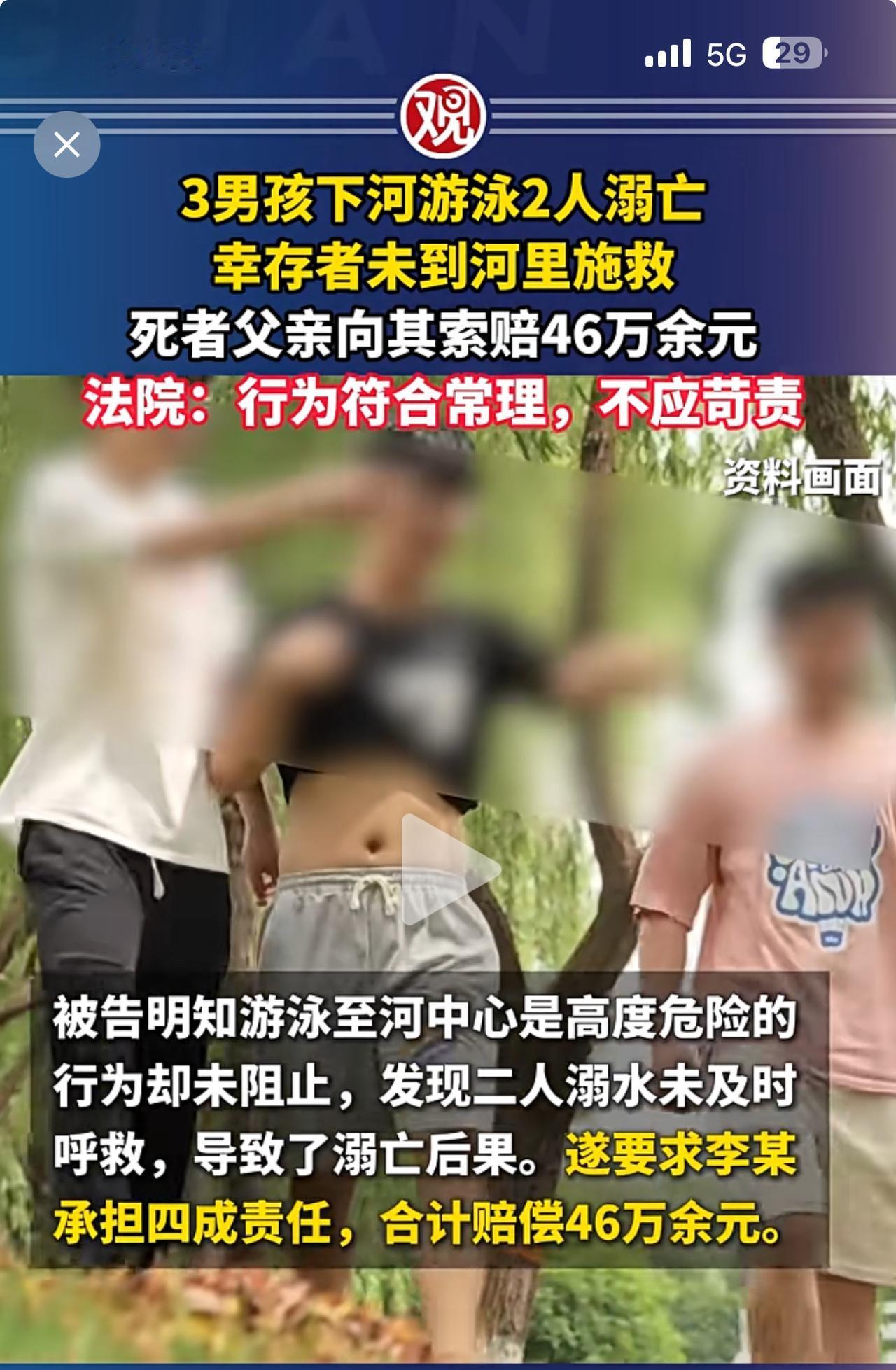 悲剧!同学3人邀约下河游泳,两人溺亡! 亡者家人将幸存者告上法庭,索赔损失46万余元,法院不予支持! 技术不行就不要去游泳!这是对自己的实力没有清晰的判断和认知!溺亡对家人来说固然痛苦。但是要幸存者负责很显然是无理取闹,他没有义务和责任对他们负责。 这件事对做家长的人来讲还是很有教育意义,怎么看好教育好自己的孩子,对危险的认知和判断非常重要。你们说呢?