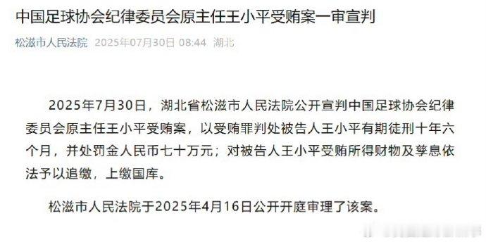 王小平受贿案二审维持原判 2025年12月24日,湖北省荆州市中级人民法院对中国足球协会纪律委员会原主任王小平受贿案二审公开宣判,裁定驳回上诉,维持原判。王小平因受贿一审获刑十年六个月,并处罚金人民币七十万元。