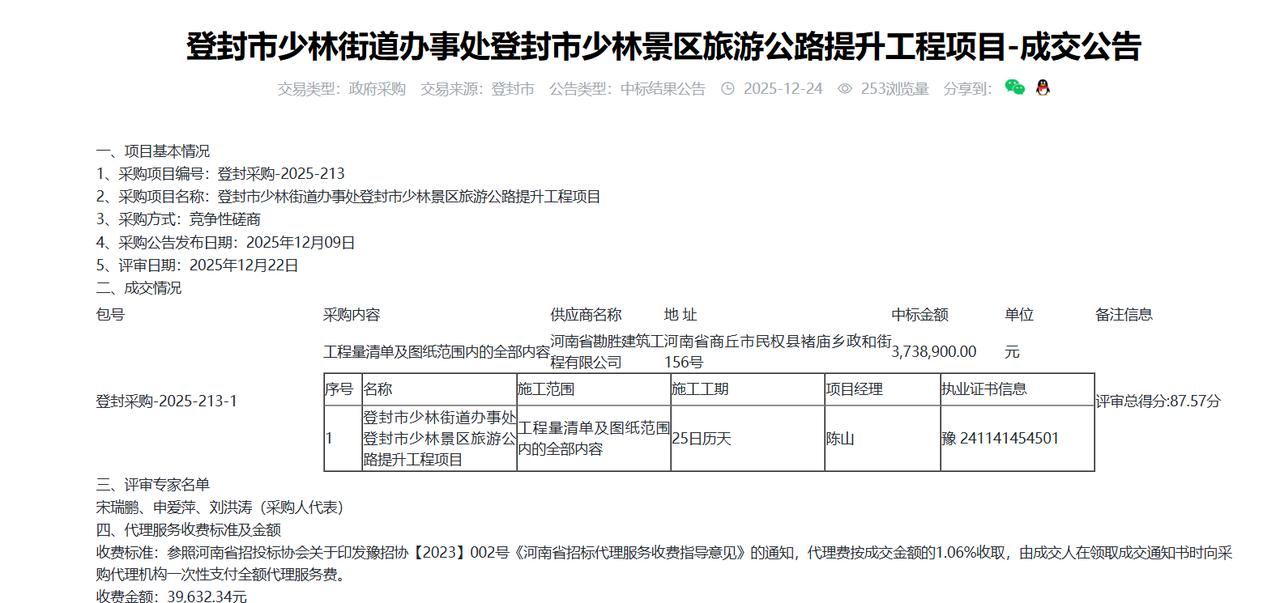 登封市少林街道办事处登封市少林景区旅游公路提升工程项目-成交公告,金额373.8万元