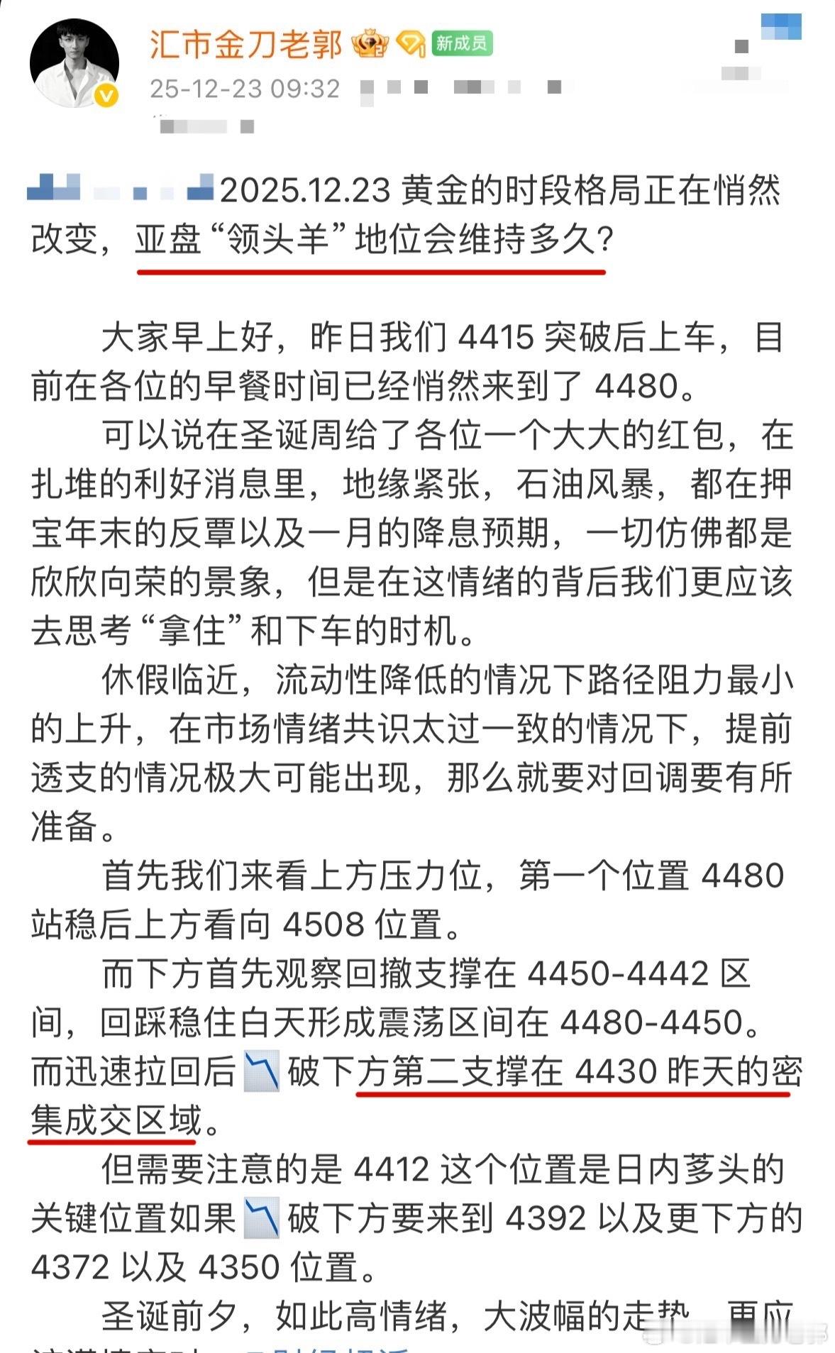 黄金 2025.12.24 平安夜能否平安?黄金再创新高,是阳谋还是乱世的推动? 大家早上好,今天平安夜,美盤会在25 日 2:00 提前休市,大家注意时间安排。截止发稿前,大黄已经来到了 4520,小白来到了 72,我们在提示的 4430 支撑位进场的茤丹,也已经有近一百个点了。 那么回看着一轮上升,冷静的思考目前的利好消息有哪些?地缘因素,降息预期,央行增持,美元指数持续📉等,但需要注意的一点,越是临近新年,临近降息落地,地缘因素临近谈判,市场的热度会逐渐降低,而且我们会发现目前的格局逐渐由亚盤拉升欧盤美盤调整为基调,这样的局势会持续多久?各大媒體也争相报道预测,是否有當年房地產的影子了?当食堂的大妈们都准备入场囤积的时候,当卖东西的商铺老板都在推荐你买黄金的时候,我们是否需要思考是否要迎来调整了呢?抛开“阴谋论”消息面,从技术层面我们来看下今天,到底该怎么去布局,来应对后续的继续拉升还是迎来调整。 首先上方压力在站稳 4500 之后来到 4540,而突破 4540 后向上往 4612 发起冲击,但首先今天关注的位置在 4524 是否能够突破站稳,无法带量突破,支撑首先来到 4500-4490 区域,震荡后下行突破,支撑来到 4477-4471 区域。 不要盲目的追茤,保持理性,保持冷静!最后祝大家圣诞快乐🎉