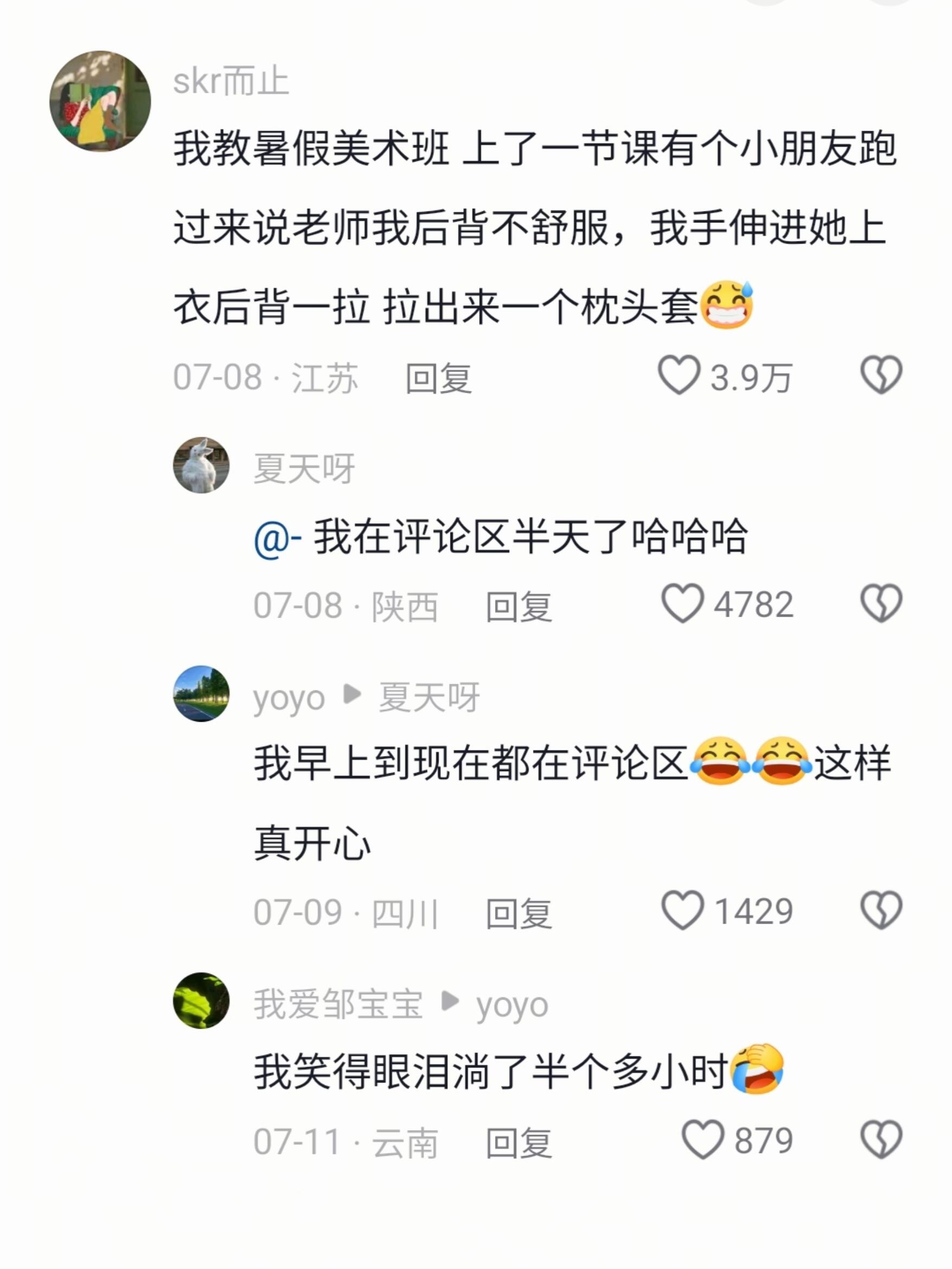 有个小朋友跑过来说老师我后背不舒服,我手伸进她上衣后背,一拉拉出来一个枕头套