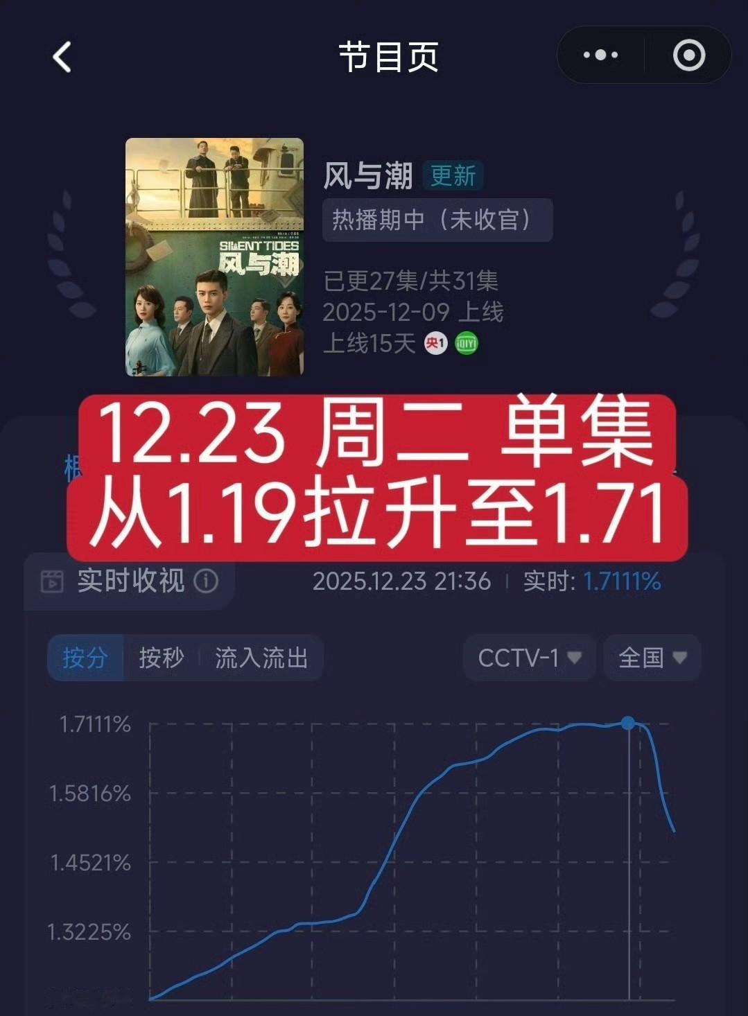 《风与潮》真是争气啊。 晚9点才播,但硬靠剧情演技把收视拉上去了,在献礼剧里这