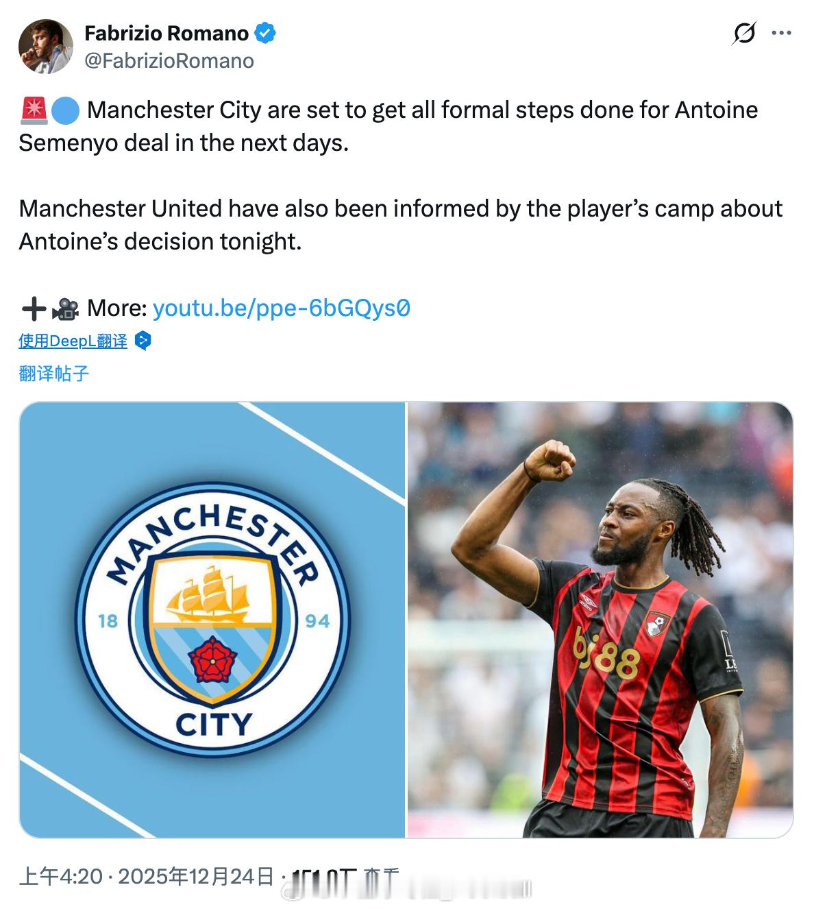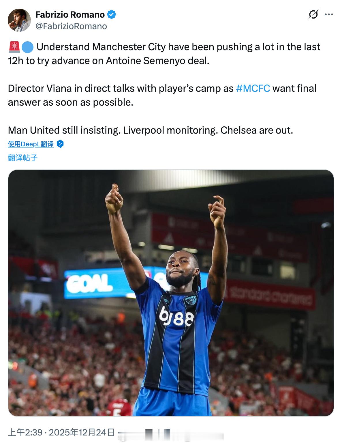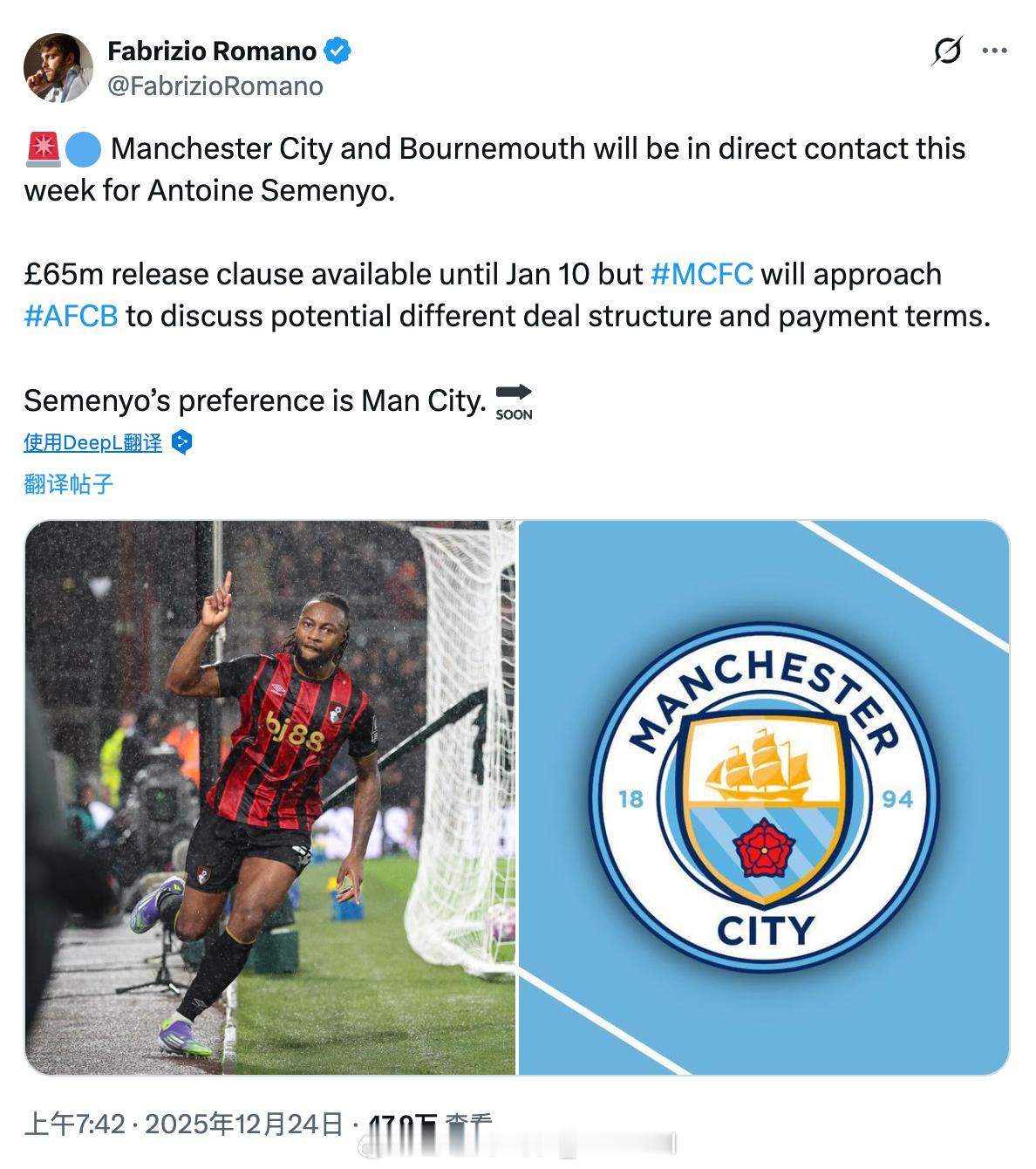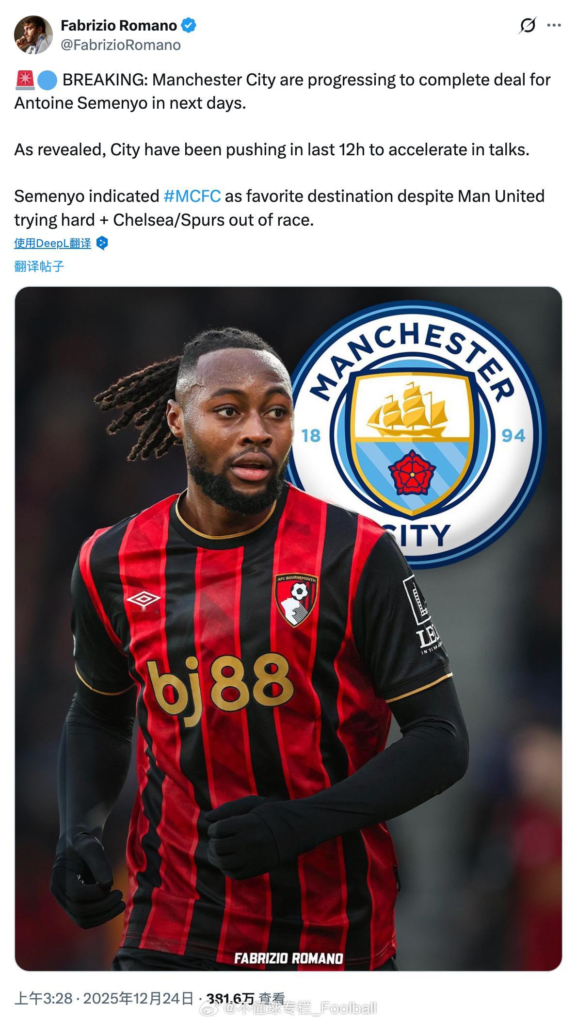 昨夜今晨塞门约转会有大进展,David Ornstein与Romano分别更新。在前两天几位记者分别确认了塞门约拒绝热刺+切尔西出局+利物浦观望的进展之后,DO说目前塞门约更倾向于加盟曼城。同时,DO说曼联从未打算让塞门约踢边翼卫+准备一旦签下塞门约就会切换体系,但塞门约依旧倾向于加盟曼城。Romano在几个小时前还说曼联依旧在坚持,不过最新的更新是曼城和伯恩茅斯即将完成交易,将直接接触讨论合同事宜,曼联也已经被告知球员的决定。冬窗大鱼在开窗前就要尘埃落定了?几条热评是“很高兴看到115项指控发挥了作用”。英超联赛