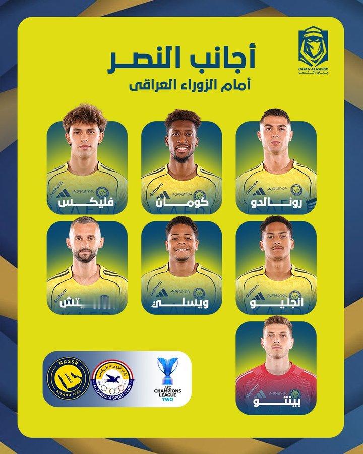 C罗 今晚参加利雅得胜利vs祖拉 比赛外援:菲利克斯、科曼、C罗、B罗、韦斯利、安热若、本托缺席球员:叶海亚、西马坎、伊尼戈、纳吉、贾巴尔、马内