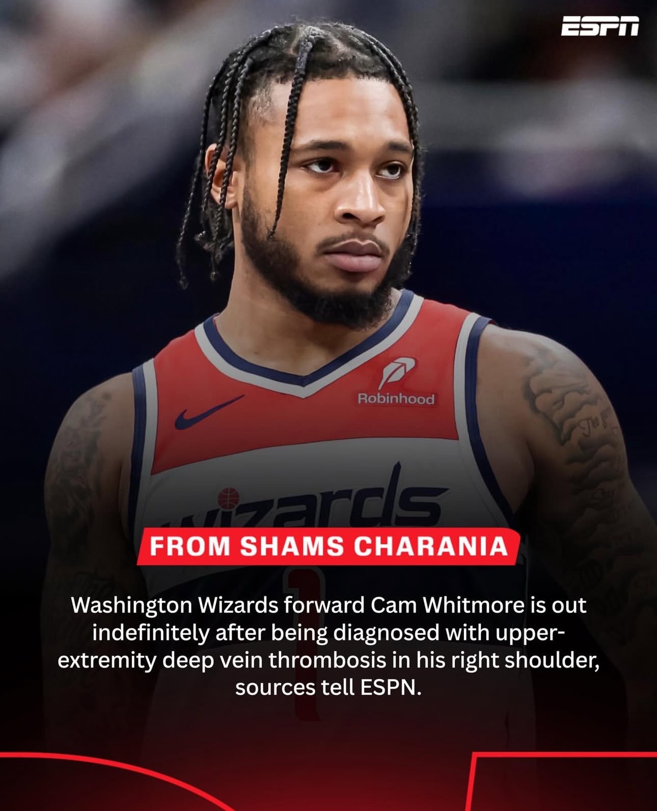 命运多舛!据Shams报道,惠特摩尔确诊右肩上肢深静脉血栓,将无限期缺阵。