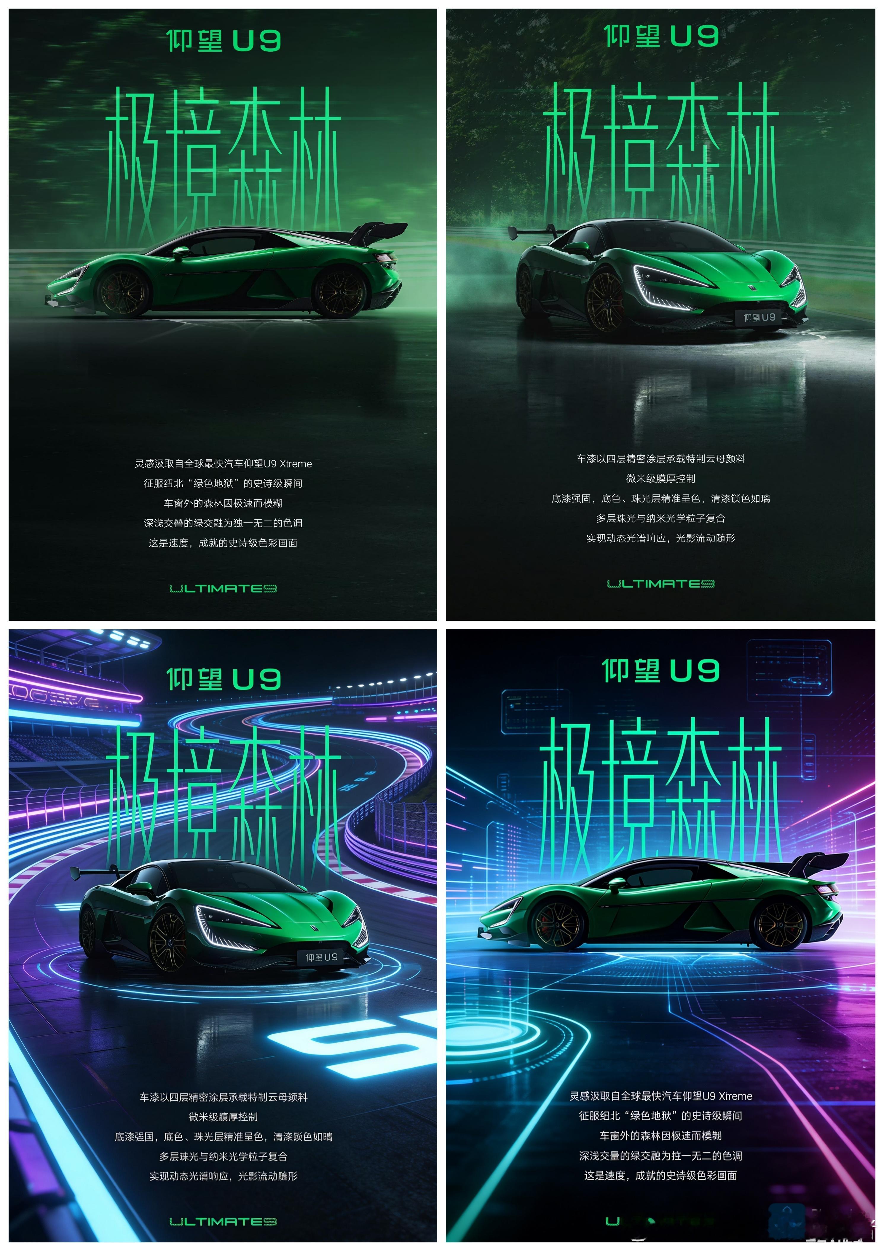 仰望U9的新配色“极境森林”,绿色的车身主要致敬仰望U9X打破纽北赛道量产电车圈速记录。纽北也被人称为“绿色地狱”,所以这个绿色就一切在情理之中了。大家觉得,仰望U9这个专属纪念色怎么样?