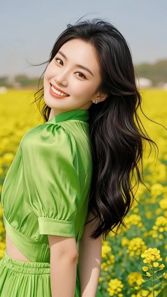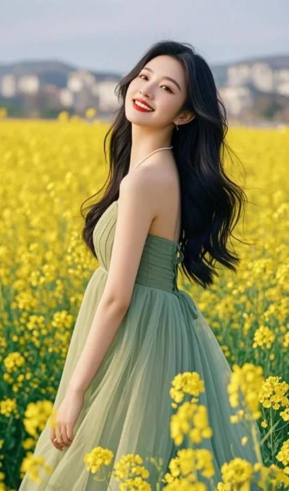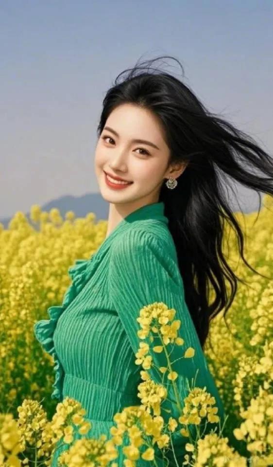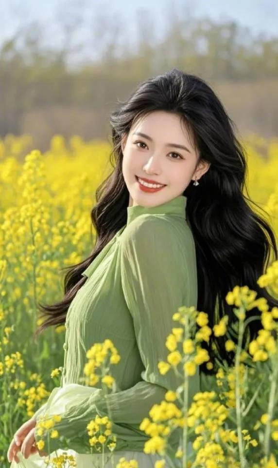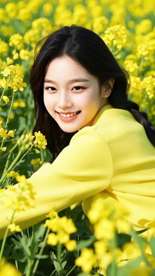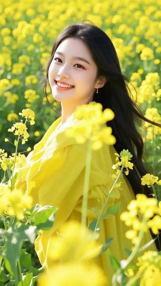 春日暖阳下,绿意盎然中,微笑的少女与花海相映成趣。