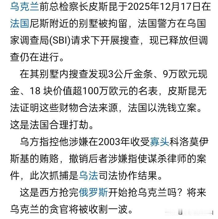 总检察长被抄家? 居住在法国也不安全。乌克兰前总检察长皮斯昆在法国的自己的别墅中,于12月17日被法国警方被抓,别墅也被搜查,并且搜出3公斤金条、9万欧元现金、价值超过100万欧元的18块名表等等。 虽然皮斯昆在不久后就被法国警方释放回家,但搜查出来的巨额资财,恐怕一时半会儿不会归还,甚至可能是永远不会归还。 法国警方是在乌克兰反腐败机构的要求下对皮斯昆采取行动的。乌克兰反腐败机构认为,皮斯昆在2003年任总检察长期间,涉嫌收受富翁科洛莫伊斯基的巨额贿赂,因此撤销了科洛莫伊斯基涉嫌谋杀律师的指控。 但是,有人质疑这是西方国家抢完俄罗斯,又要抢乌克兰?这种事情,说这种话,似乎有点画蛇添足。