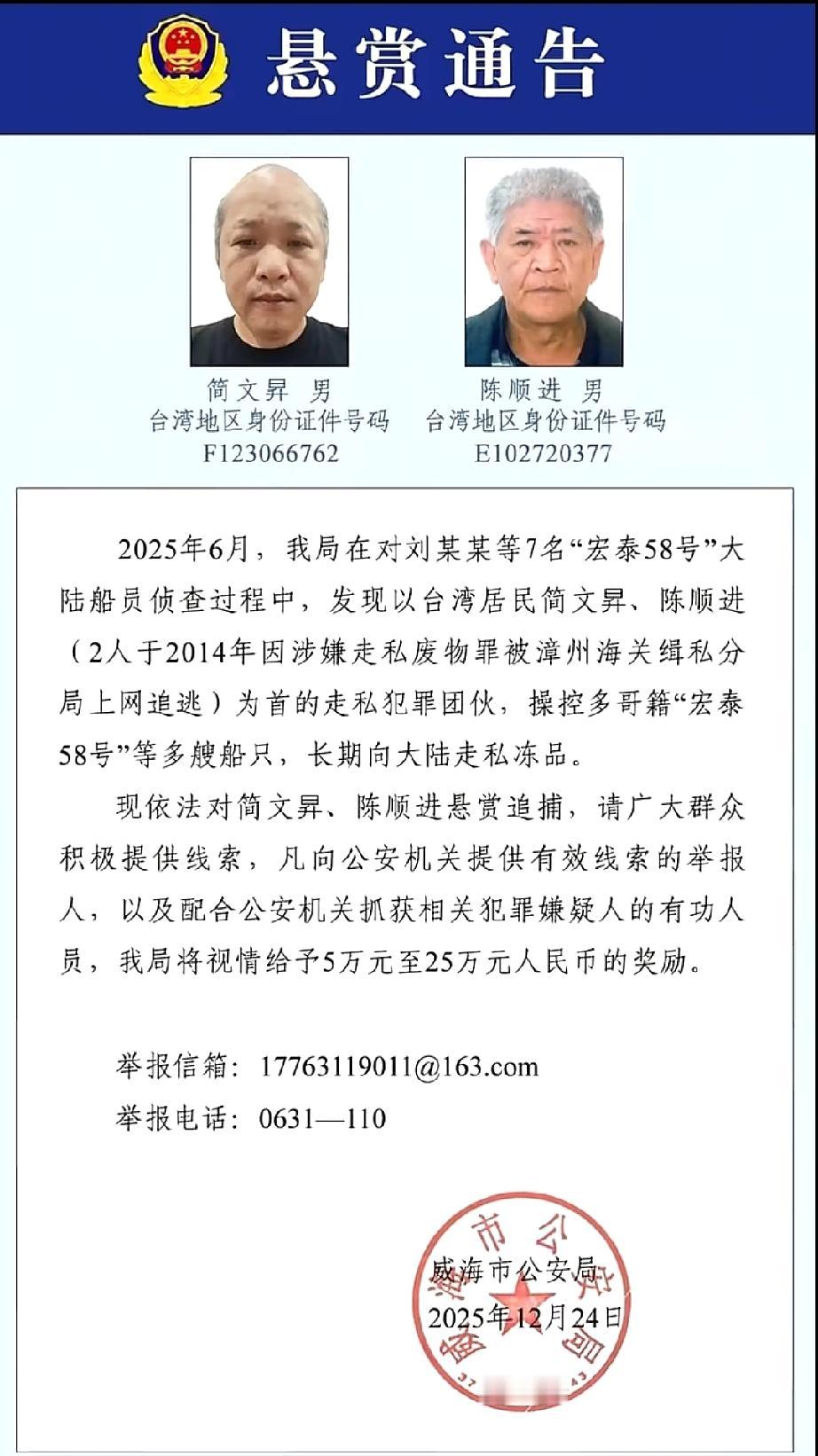 悬赏25万! 台籍嫌犯指挥外籍货轮长期走私, 国台办怒斥民进党甩锅大陆。 这两个有前科的台湾人胆子可真不小!威海警方刚刚发布了悬赏通告,简文昇、陈顺进竟然指挥多哥籍货轮"宏泰58号",在公海上长期向内地走私冻品。更讽刺的是,今年2月民进党还污蔑说这艘船损坏海底电缆是"大陆方面故意破坏",结果被国台办直接戳穿:这其实是嫌犯在走私过程中操作不当造成的事故! 原来这两人早就有犯罪记录,2014年就被漳州海关列入通缉名单。现在警方拿出5万到25万的奖金征集线索,举报的邮箱和电话都公开了。国台办发言人严厉批评台当局:"一边包庇罪犯,一边还往大陆泼脏水,这样下去迟早要自食恶果!" 看看这一套操作:用外籍货轮当幌子、靠走私冻品赚黑钱,一出事就把脏水往大陆身上泼...犯罪团伙和台当局这简直是"天生一对"!有网友调侃:"要是海底电缆会说话,估计早就跳出来指认真正的凶手了!" 大家觉得这种跨境犯罪该怎么从根源上解决?来评论区说说你的想法吧