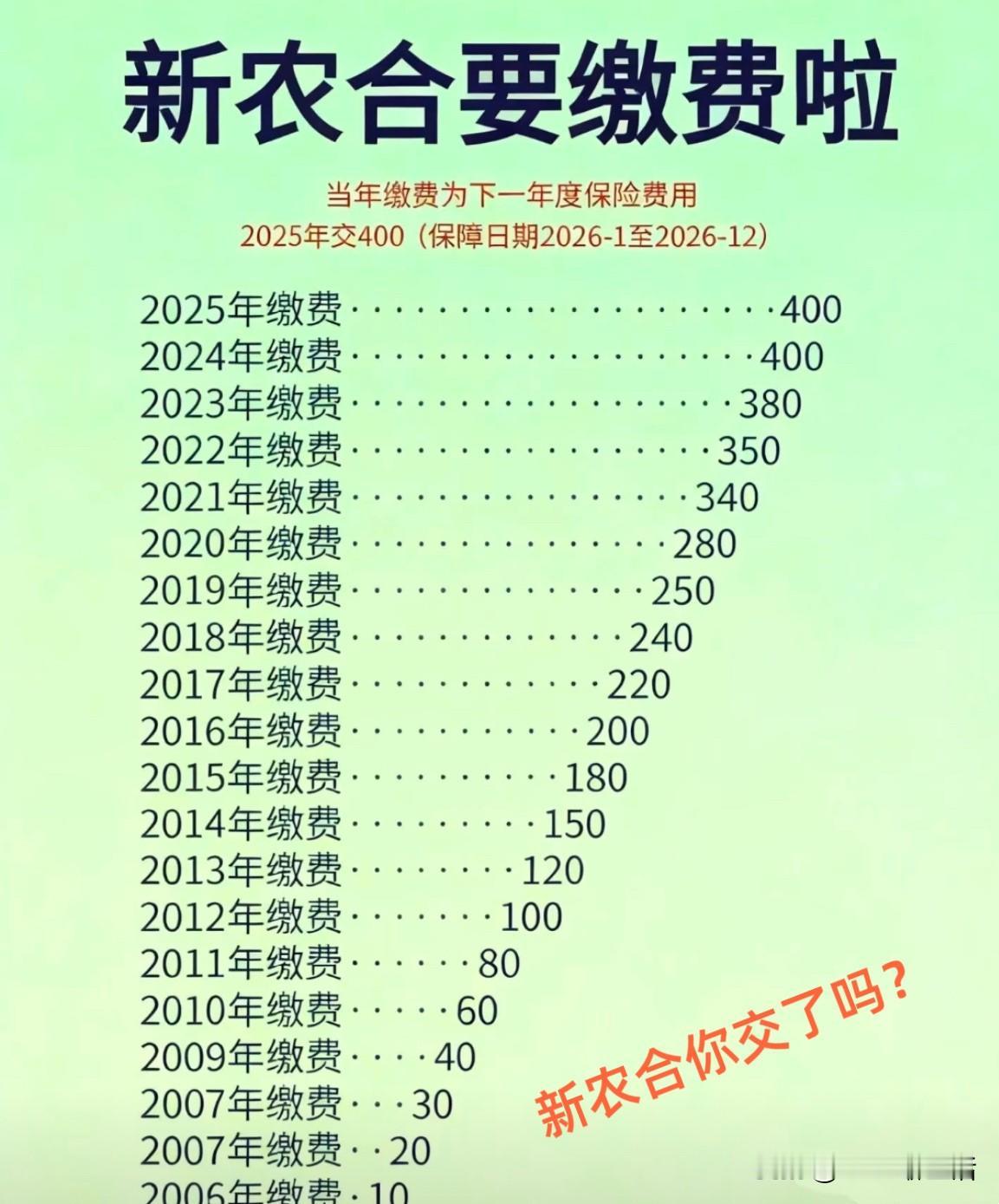 新农合都交了吗? 一家人的账算下来真肉疼 新农合你交了吗?眼瞅着缴费截止日期越来越近,不少人又开始犯嘀咕了。 有网友调侃:要是股市能像新农合缴费金额这样稳步走高,咱股民做梦都能笑醒!这话真说到心坎里了。这几年新农合缴费标准确实年年涨,单看一个人不多,可咱农村家庭少则三四口,多则五六口,一笔算下来可不是小数目,对普通农户来说确实有点压力。 但话说回来 吐槽归吐槽,新农合的作用真不小。平时头疼脑热看病能报销,遇上大病更是能帮着扛住大半压力,这可是咱农民的“医疗护身符”。 钱虽有点肉疼,但这笔账到底值不值?你今年给全家交新农合了吗?评论区里唠唠呗!