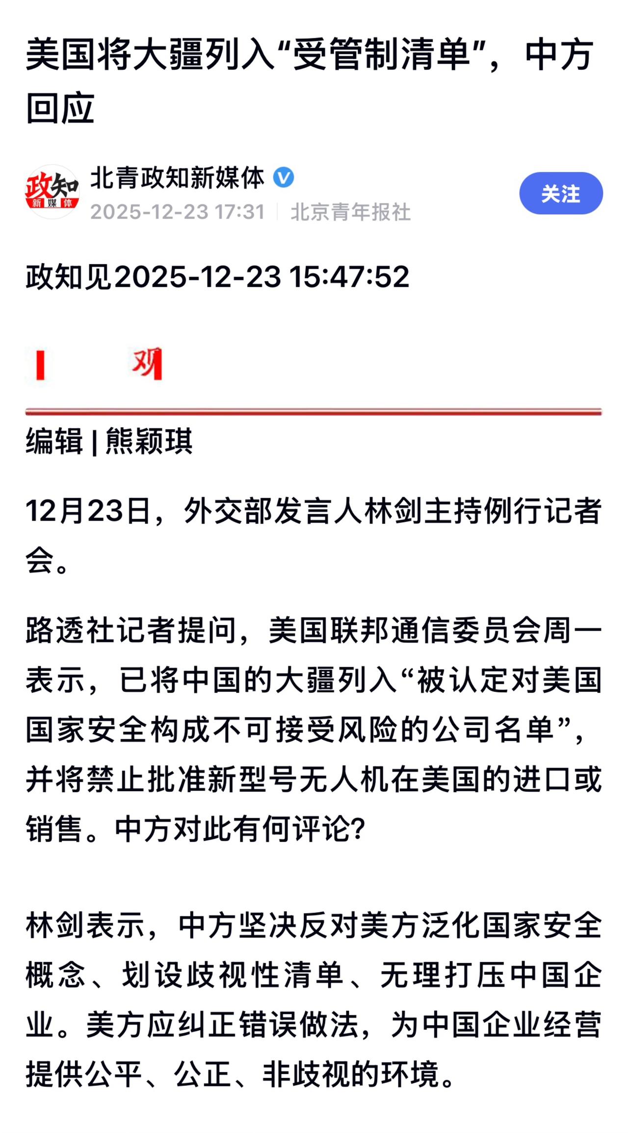 美国将中国大疆等外国制造的无人机及零部件列入“受管制清单”并禁止新型号进口。