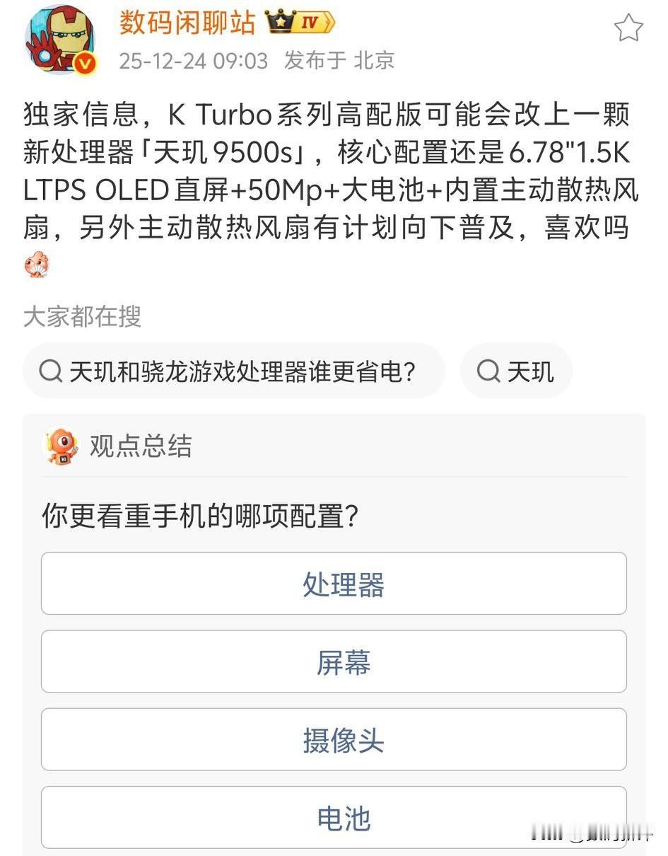 OPPO的K系列机型上天玑9500s处理器[思考]这颗是新处理器,会不会是定制版本,本质上是天玑9400++,还有内置风扇,1.5K分辨率,LTPS直屏,电池容量希望越大越好[捂脸]一加普及高刷,OPPO普及风扇?明年的性能机也是这两个策略了,高刷+风扇+超大电池+不错的外围