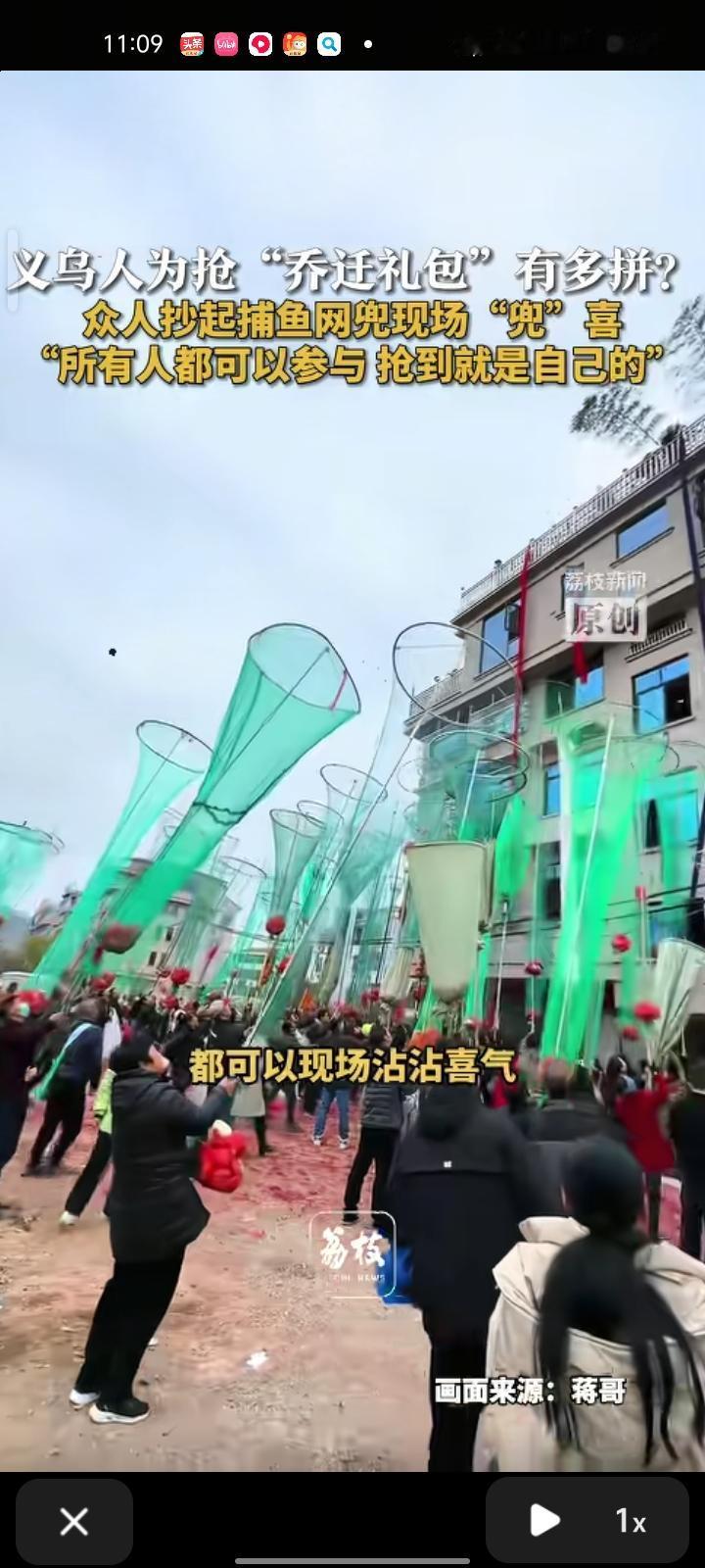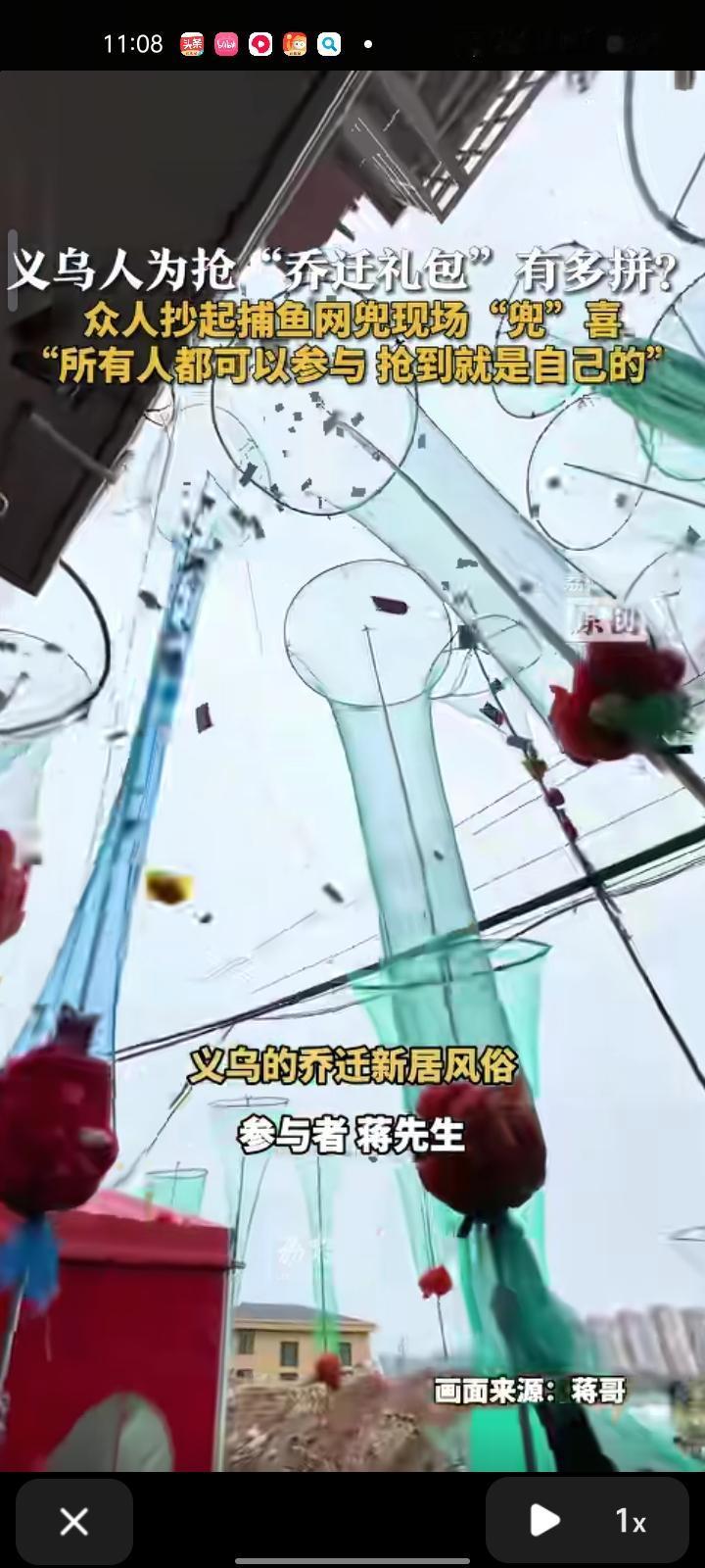 12月23日,金华义乌市。义乌人为抢“乔迁礼包”是有多拼?房东乔迁新居撒红包、零食庆祝,人们自制五米网兜抢礼物沾沾喜气,男女老少都能参与,抢到的就是自己的。