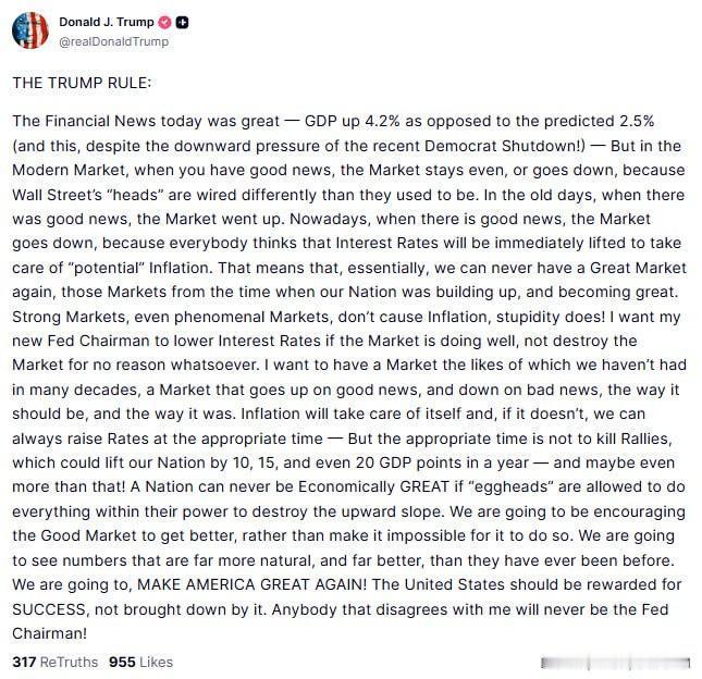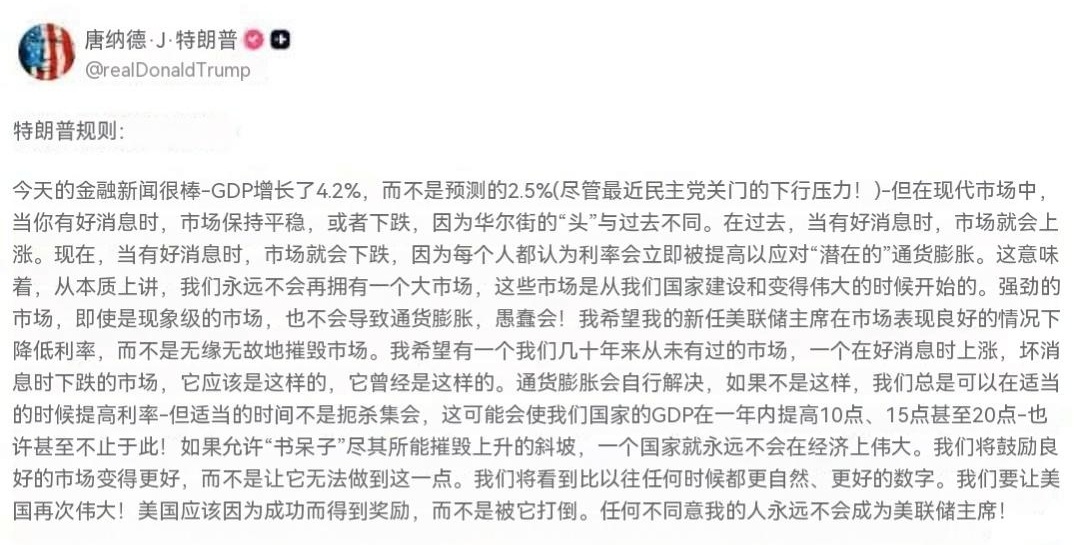 特朗普通过 Truth Social 发文:我希望我的新任美联储主席在市场表现良好时降低利率,而不是毫无理由地摧毁市场。任何与我意见相左的人都永远当不上美联储主席!海外新鲜事热点现场