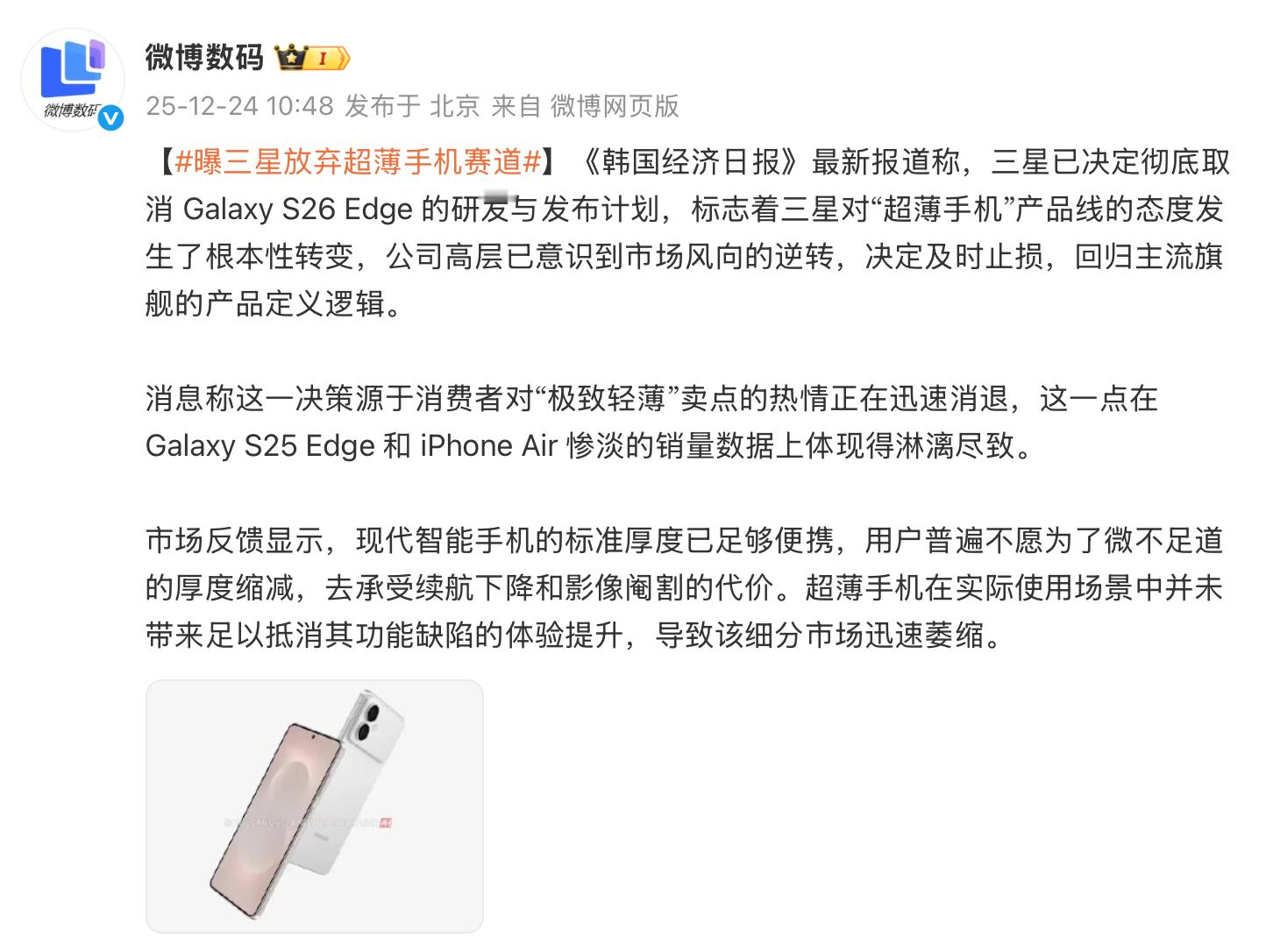阿星的超薄机型也要放弃了?岂止纤薄,仅此一代?早前还在传阿果的Air机型也不准备上下一代了。超薄机型,有没有未来呢。薄是可以,但是不能割舍太多的其他,不然得不偿失。特别是像电池。国产这边现在轻薄机型,也都有大电池来支撑。在极致的超薄和大电池之间,各位更倾向哪个?曝三星放弃超薄手机赛道