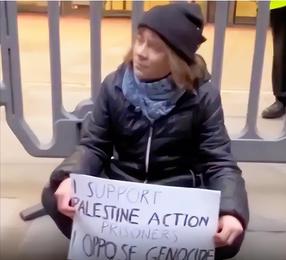 说好的西方言论自由呢?最近伦敦街头直接上演大场面,靠喊环保火遍全球的瑞典“环保少女”盘腿坐在马路边为巴勒斯坦发声,结果没一会儿就被警察当场带走了,这直接让不少人看呆了。 今年22岁的通贝里之前在全世界的标签都是“环保斗士”,16岁那年,她就敢在瑞典议会门口静坐,发起罢工活动,天天喊着要重视气候变化。 后来还跑遍各种国际峰会,跟各国大佬叫板,成了年轻人环保运动的代表人物,可谁也没想到,这次她直接跨界,跑到伦敦街头为巴勒斯坦说话。 当天在伦敦芬乔奇街的阿斯彭保险公司大楼外,通贝里直接盘腿坐在地上.她手里举着块自制的牌子,正面写着支持巴勒斯坦行动组织的囚犯之类的话,背面还印着巴勒斯坦国旗。 事实上这个“巴勒斯坦行动组织”,早就被英国政府列为恐怖组织了。 现场有路人拍了视频,能看到警察慢慢走到她跟前先跟她说“我要把牌子拿走了”,然后就把标语牌收了,接着又问她“能不能站起来配合”,通贝里摇了摇头没答应,最后警察把她给拘捕了。 最近这段时间,欧洲不少地方都有支持巴勒斯坦的抗议活动,大家主要是心疼巴以冲突里受牵连的普通人,想呼吁关注人道主义危机。 但像通贝里这样有全球影响力的公众人物直接下场参与并被捕,确实挺少见的。 现在网上议论得挺热闹,有人说通贝里有勇气,也有人担心,她是不是没搞清楚自己支持的组织背景,万一影响了自己之前积累的好名声就不值了。 还有个关键问题,通贝里能不能够上《反恐法》的处罚标准,还得等后续的司法程序来定。 截至目前通贝里这边还没说啥,警察也没公布后续会怎么处理,不过倒是让更多人关注到了巴以问题。