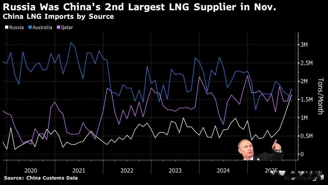 根据彭博社援引中国海关数据报道,俄罗斯在2025年11月已成为中国第二大液化天然