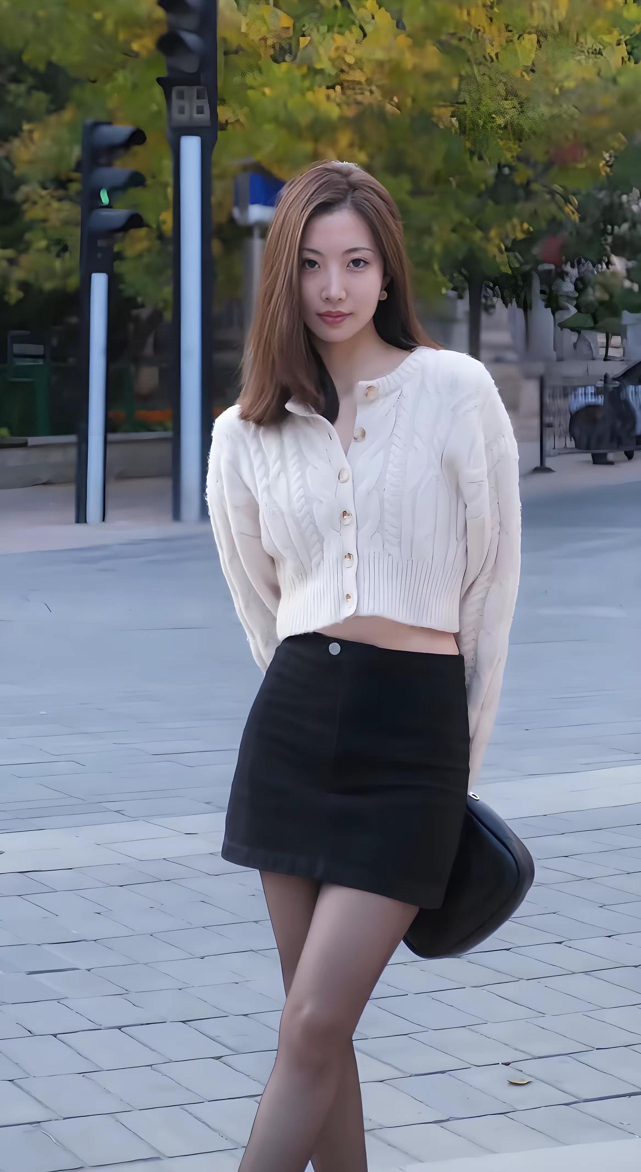 秋日穿搭指南:白色毛衣+黑色短裙,简约优雅,尽显都市女性魅力。