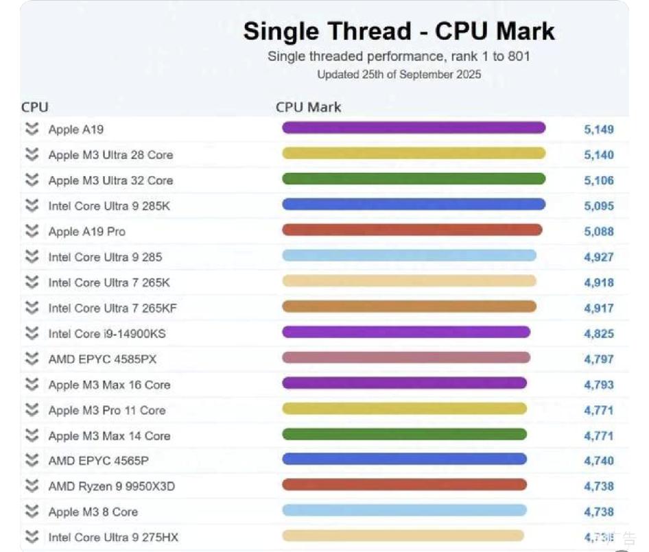 A19 pro的单核性能登顶? A19 pro的单核性能超越了苹果自家的m4,inter的14900ks、u9 285k和amd的9950x,成为单线程峰值性能最强的芯片。