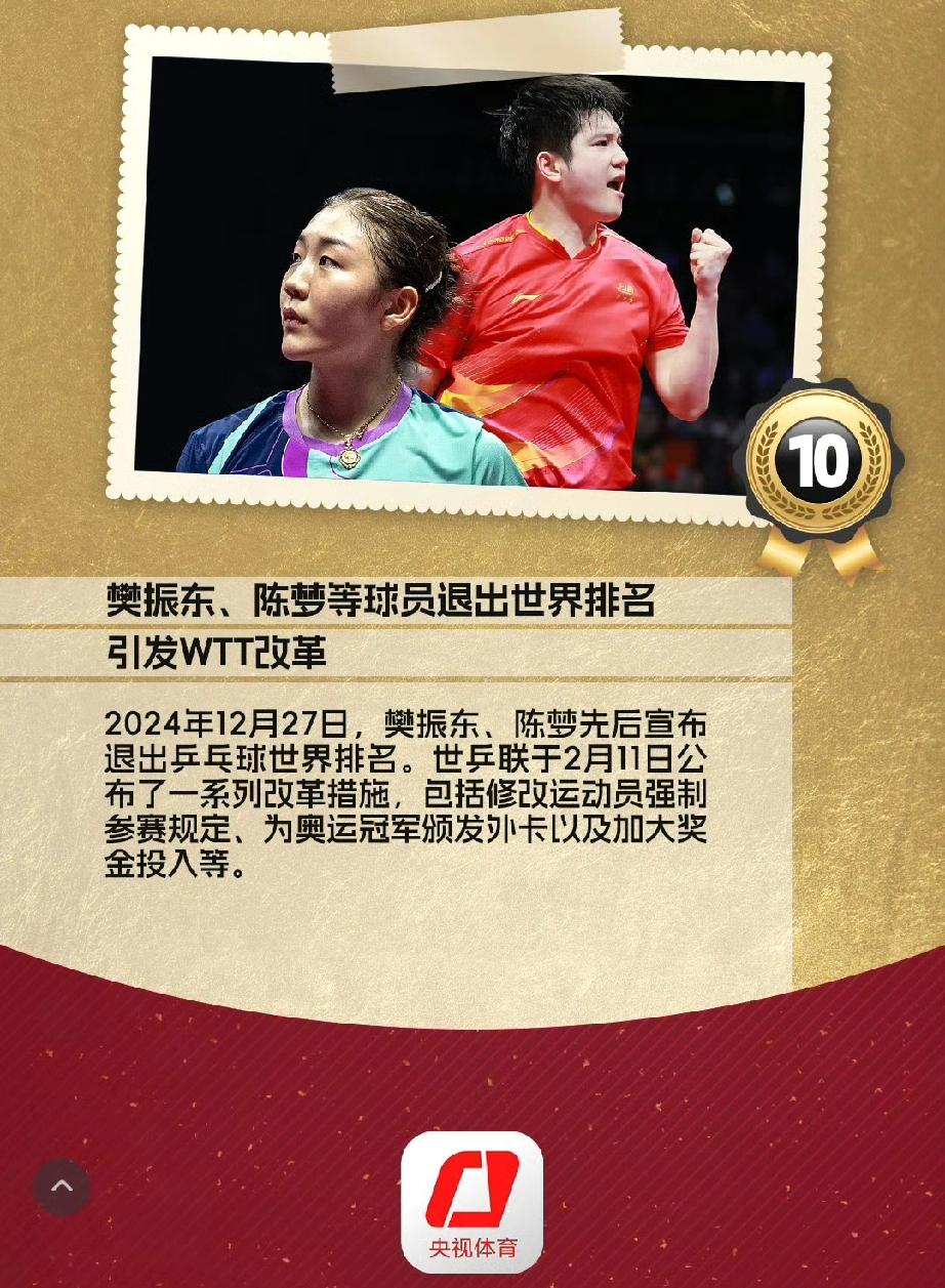 央视体育评选2025十大国内体育新闻,“樊振东、陈梦等球员退出世界排名,引发WTT改革”位居第十位! 樊振东等发文退出世界排名新闻当天引爆热搜,引发国内各平台剧烈讨论。 其后续影响也在不断发酵中,催化了WTT改革,甚至包括中国乒协人事变动。 算得上近年来国内体育最具影响力大事件之一!