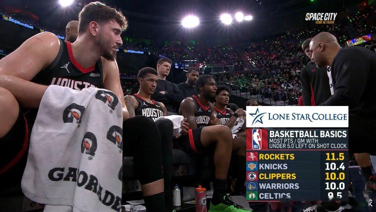 在投篮时钟剩余时间不足5秒的情况下,场均得分最高的球队排名如下(由高至低):1. 火箭 - 11.5 分2. 尼克斯 - 10.4 分3. 快船 - 10.0 分(并列第三)4. 勇士 - 10.0 分(并列第三)5. 凯尔特人 - 9.5 分这究竟是好事还是坏事火箭vs快船休斯顿火箭休斯顿火箭