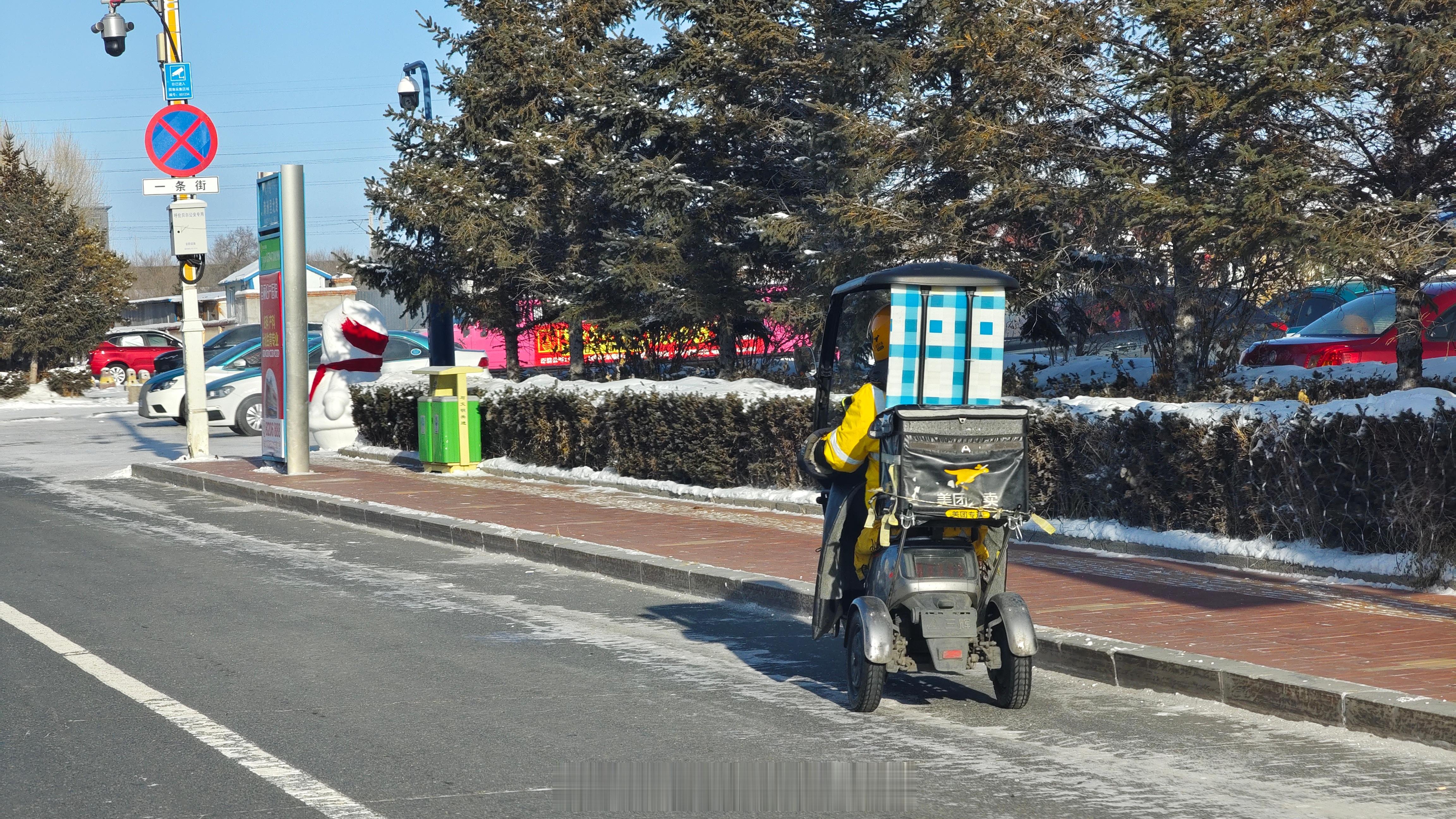 在东北送外卖的小哥骑的都是这种电三轮不倒翁,确实在冰天雪地里这种车会更稳,压弯的时候不至于被突然出现的地穿甲滑出去,而且这个轮胎好像也是冬季胎,花纹很深,跟普通的不太一样~
