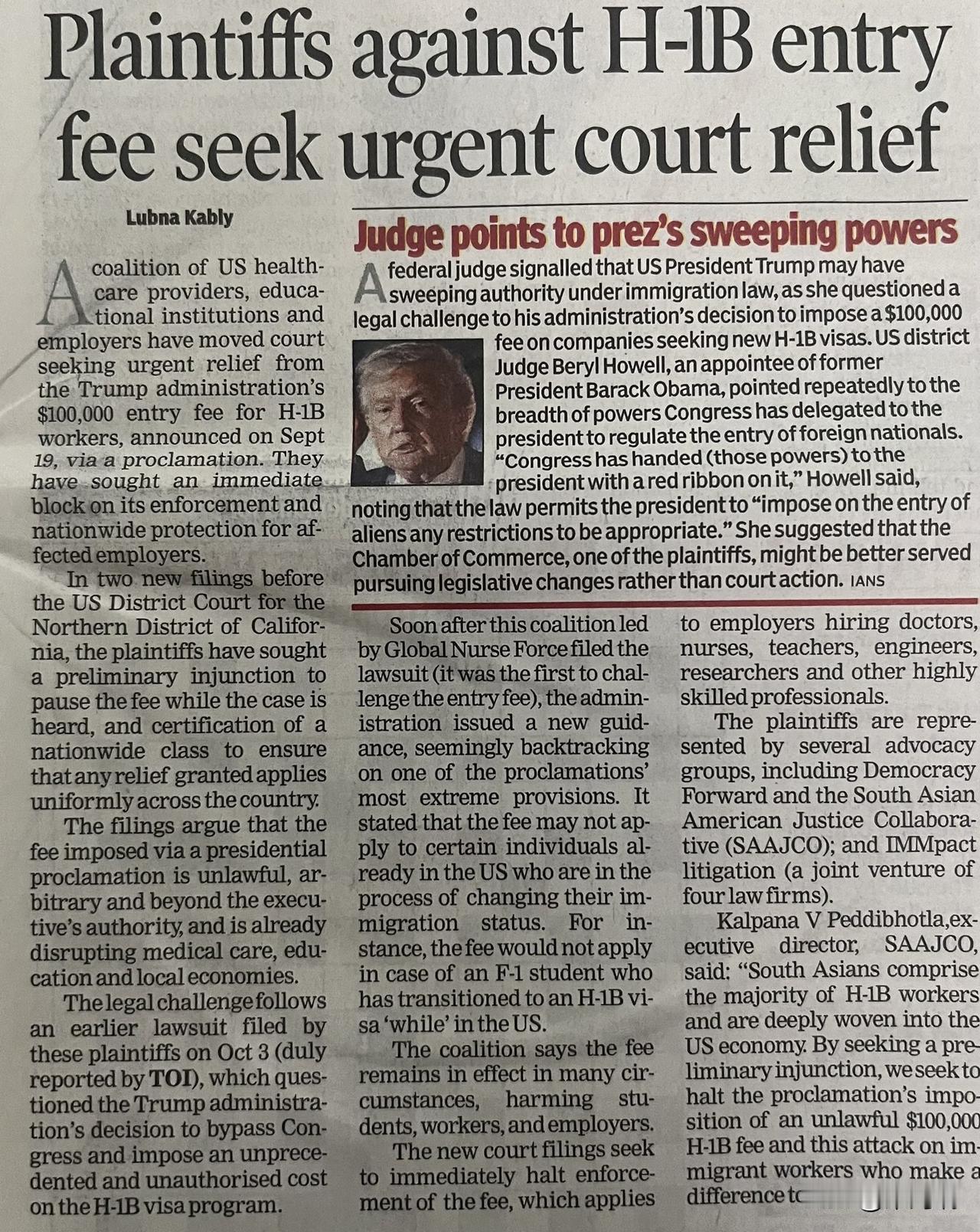 美国联邦法官周二裁定:川普政府可以继续推进对新H-1B签证申请征收10万美元费用。法官Howell认为,总统此举有明确的法律授权。这对依赖海外高技能人才的美国科技公司是个打击,也为川普收紧移民、提高企业用外籍劳工成本、倒逼用本土劳工的政策路线加了一层司法背书。起诉阻止该政策的美国商会仍可上诉。 华盛顿特区联邦地区法院法官 Beryl Howell 裁定,总统根据《移民与国籍法》(INA)拥有广泛的行政裁量权,可以通过调整规费来保护国内劳动力市场,因此该项高额收费标准具备“法律授权”。 企业成本剧增: 10万美元的申请费相较于此前数千美元的水平是指数级的增长。这对于需要大量 H-1B 名额的科技巨头(如 Google、Meta、Amazon)以及中小型初创企业而言,将直接导致招聘成本飙升。 此举旨在通过“价格杠杆”倒逼美国企业减少对海外廉价技术劳动力的依赖,优先聘用美国本土员工,或将高薪职位留给真正的顶尖人才。 这一裁决被视为川普政府“美国优先”移民政策的司法胜利。由于目前保守派在联邦司法系统中占据优势,美国商会(US Chamber of Commerce)虽可向巡回上诉法院提起上诉,但翻盘难度较大。 行业连锁反应: 科技行业普遍担忧,此举可能导致人才流向加拿大、欧洲或新加坡等移民政策更友好的国家,从而削弱美国在人工智能等关键领域的全球竞争力。