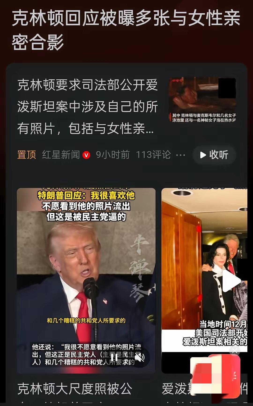 美国政坛大地震即将开始,克林顿鱼死网破,要求公布自己爱泼斯坦案全部的照片!特朗普表示很不愿意看到这些照片公布。 克林顿非常愤怒,司法部门公布了自己的部分不雅照片,其中有在浴池里与女性亲密接触的照片。 先澄清一个关键事实!上述网传说法大多没权威依据,咱得按真事儿说清楚! 司法部确实公开了爱泼斯坦案相关档案,但不是“部分不雅照”,而是数十万份文件,首批就有119页全涂黑的内容,遮得那叫一个严实。 克林顿这边压根没说过“要求公布全部照片”! 他的办公室只回应过——和爱泼斯坦早就没往来,对其罪行一无所知。 所谓“浴池亲密照”更是没影的事,权威媒体没一家报道过,纯是网传虚构。 特朗普的态度也没那么直白! 他只说“认识爱泼斯坦的人不少”,没明说“不愿意看照片公布”。 之前司法部撤过部分涉及他的照片,后来解释是“保护照片中女性隐私”,核实无受害者后又恢复了,不是啥“误删”。 这事儿的源头是国会施压! 今年11月国会通过法案,要求12月19日前公开相关文件,特朗普作为总统签了字。 结果文件一出来,两党直接吵翻——民主党嫌涂黑太多,共和党吐槽“针对性曝光”。 最核心的争议还是“透明度”! 爱泼斯坦2019年死在狱中,官方定的“自杀”,但外界一直有“谋杀”“勒索名单”的猜测。 现在公开的文件里,确实有克林顿和爱泼斯坦前女友马克斯韦尔的旧合影,但没任何违规暗示。 比尔·盖茨、英国前王室成员安德鲁王子也被牵扯进来! 网上传的合影是真的,但得说清楚——那是2018年抗疟疾峰会的公开照片,和爱泼斯坦案件没直接关联,别瞎联想。 最该被关注的是受害者! 案件里有不少未成年女孩受害,最小的才14岁。 这次公开的文件里,1200多名受害者及家属的身份信息全被依法编辑删除,就是为了保护她们不再受二次伤害。 可现在的舆论走向有点跑偏! 大家都盯着政客的合影猜来猜去,却忘了受害者想要的是真正的正义。 这些年案件推进磕磕绊绊,真相还没完全浮出水面,政客们倒先成了舆论焦点。 美国政坛这波操作也挺讽刺! 嘴上喊着“司法公正”“信息透明”,可关键文件说涂黑就涂黑,该保护的受害者信息藏着,不该联想的照片却被反复炒作。 到底是为了正义,还是为了政治博弈? 放到现在看,这事儿给我们提了个醒: 任何涉及公众人物的案件,真相永远比八卦重要。 别被网传的虚假信息带偏,也别让受害者的痛苦,变成政客们互相攻击的工具。 克林顿没主动求曝光,特朗普也没明确反对,所谓“鱼死网破”更多是外界猜测。 真正该追问的是——那些被涂黑的文件背后,到底藏着什么? 受害者的正义,什么时候能真正落地? 现在案件还在推进,后续可能还会有更多文件公开。 但不管曝光多少,我们都得记住: 八卦终会过时,可受害者的伤痛需要被正视,真相需要被还原,这才是最该关注的核心。 各位读者你们怎么看?欢迎在评论区讨论。