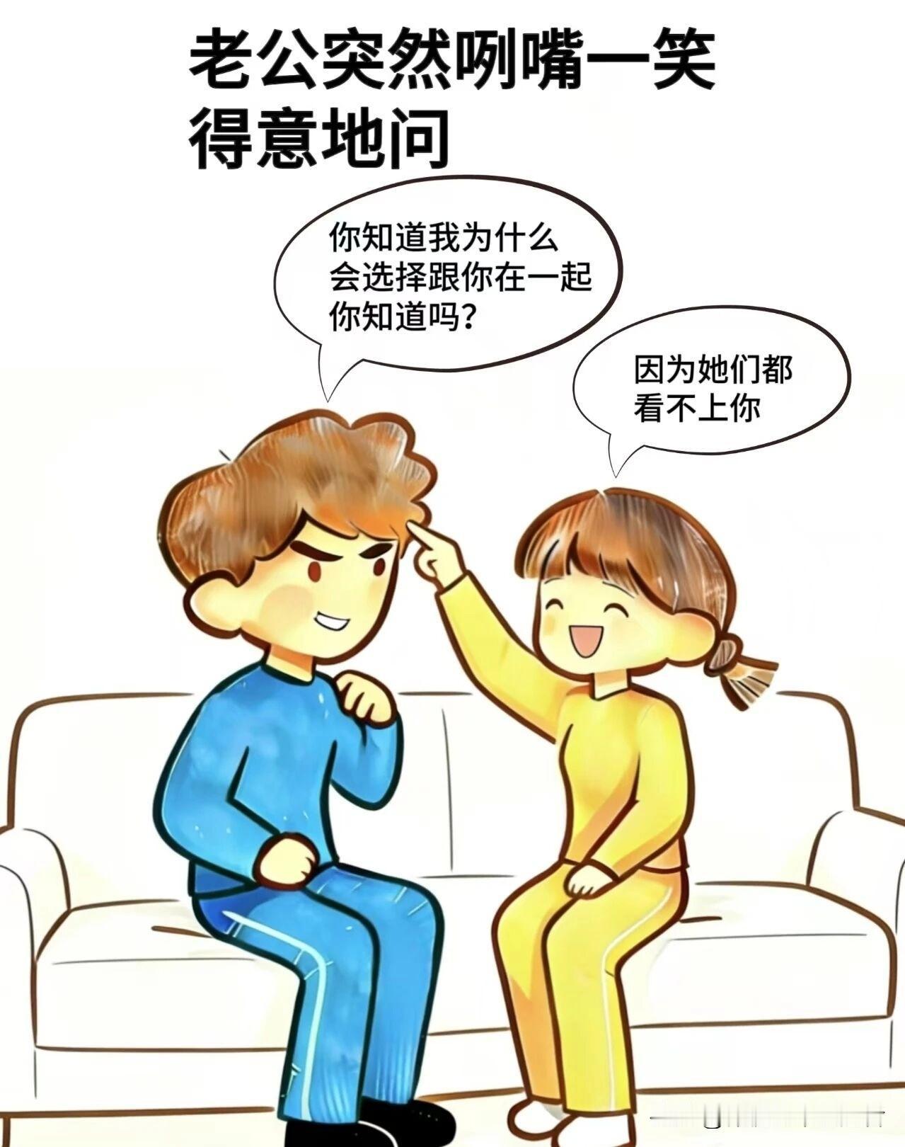 趣味漫画:老公严肃问老婆:在一起我吼过你吗?心动过别的美女吗?老婆都答没有,老公得意问为啥选她,老婆笑答:因为她们都看不上你搞笑漫画 搞笑漫画夫妻