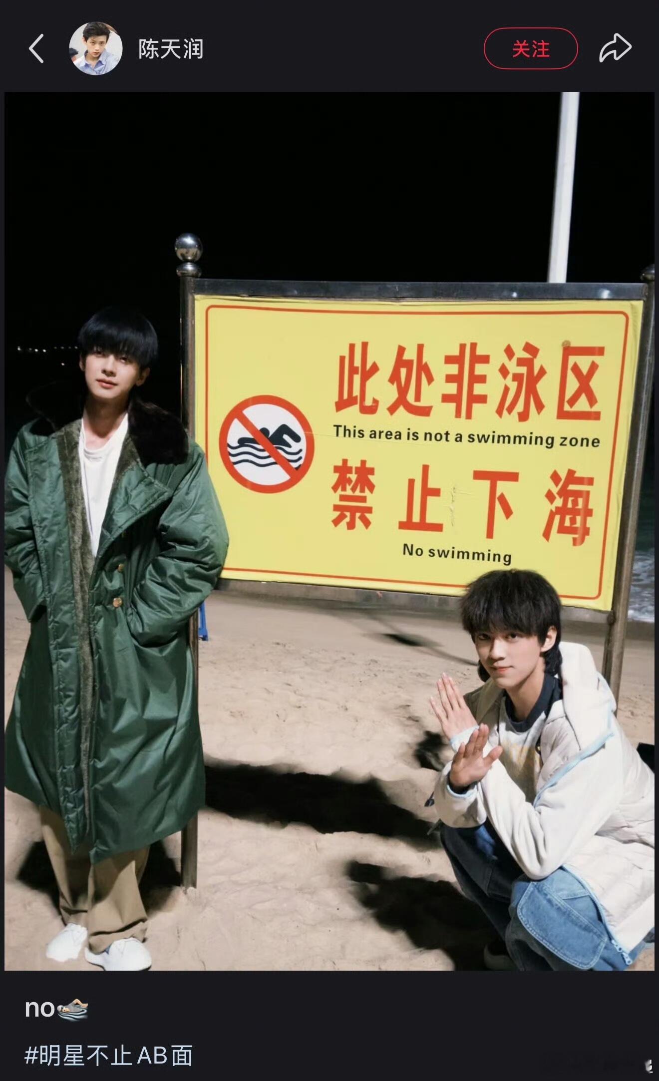 陈鹤一陈天润禁止下海合照陈天润和陈鹤一这波回应也太有梗了!2025年12月23日两人晒出和“禁止下海”警示牌的创意合照,还靠交叉手势强化寓意,用戏谑的方式回应了此前关于两人“下海”参演耽改剧的猜测,直接把网友笑晕。其实这事儿还源于刘俊昊此前的一句“下海吗?”,因饭圈“下海”的特殊含义还引发过术语误读争议,没想到他俩用这么高情商的方式精准破局,这脑洞和幽默感属实拿捏了~陈鹤一陈天润禁止下海合照
