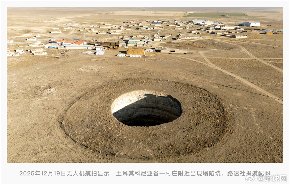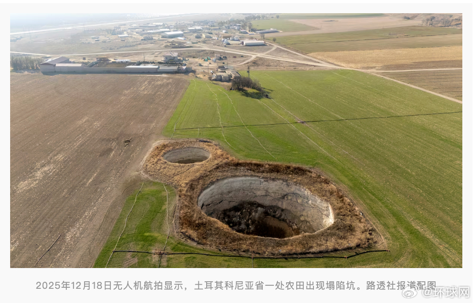 #土耳其中部现近700个巨大天坑#【土耳其中部农业区出现近700个巨大天坑,疑因气候变化导致】据路透社12月24日报道,由于降雨量减少和地下水水位下降,近年来土耳其中部农业地区出现数百个巨大天坑,引发农民和环境专家的担忧,他们认为是气候变化导致这些深坑出现。据报道,土耳其科尼亚理工大学地质学教授费图拉·阿里克称,近年来科尼亚盆地塌陷坑的形成速度加快,目前总数已接近700个。阿里克表示,塌陷坑“数量增加的主要原因是气候变化和干旱,自2000年以来,这些因素已影响了全世界。干旱导致地下水位逐年缓慢下降。”他继续说,现在地下水位下降速度已达每年4至5米,远超2000年代每年0.5米的数据,这令土耳其主要农业部门感到非常担忧。干旱与地下水枯竭迫使当地农民开凿更多水井,其中许多属于无许可水井,这进一步耗竭地下水资源,使问题愈发严重。阿里克表示,尽管新形成的天坑尚未造成人员伤亡,但其不可预测性正威胁当地居民生命财产安全。路透社提到,在过去两年间时间里,当地农民穆斯塔法·西克的农田出现了两个天坑。西克回忆,2024年8月第二个天坑形成时,他兄弟就在不远处工作,当时他听到了“震耳欲聋的恐怖轰鸣声”。地质学家在西克的农田勘察后发现另外两处可能形成塌陷坑的区域,但无法预测具体的塌陷时间。“我们担心吗?当然,我们非常担心。” 西克说道。