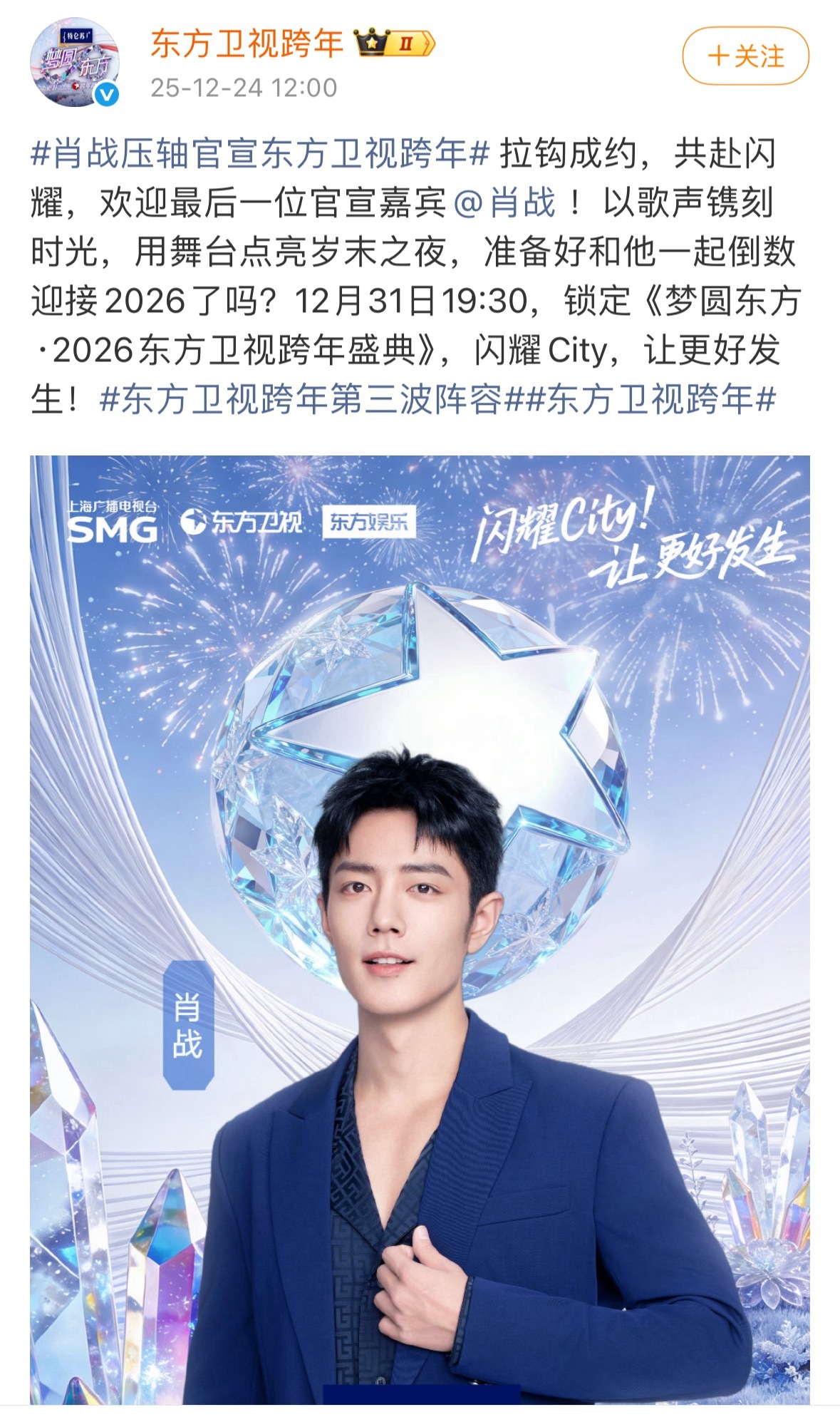 肖战压轴官宣东方卫视跨年肖战压轴官宣加盟东方卫视跨年演唱会,25年影视歌全丰收,实绩口碑破圈层的好,年底还有舞台,简直是不要太爽!