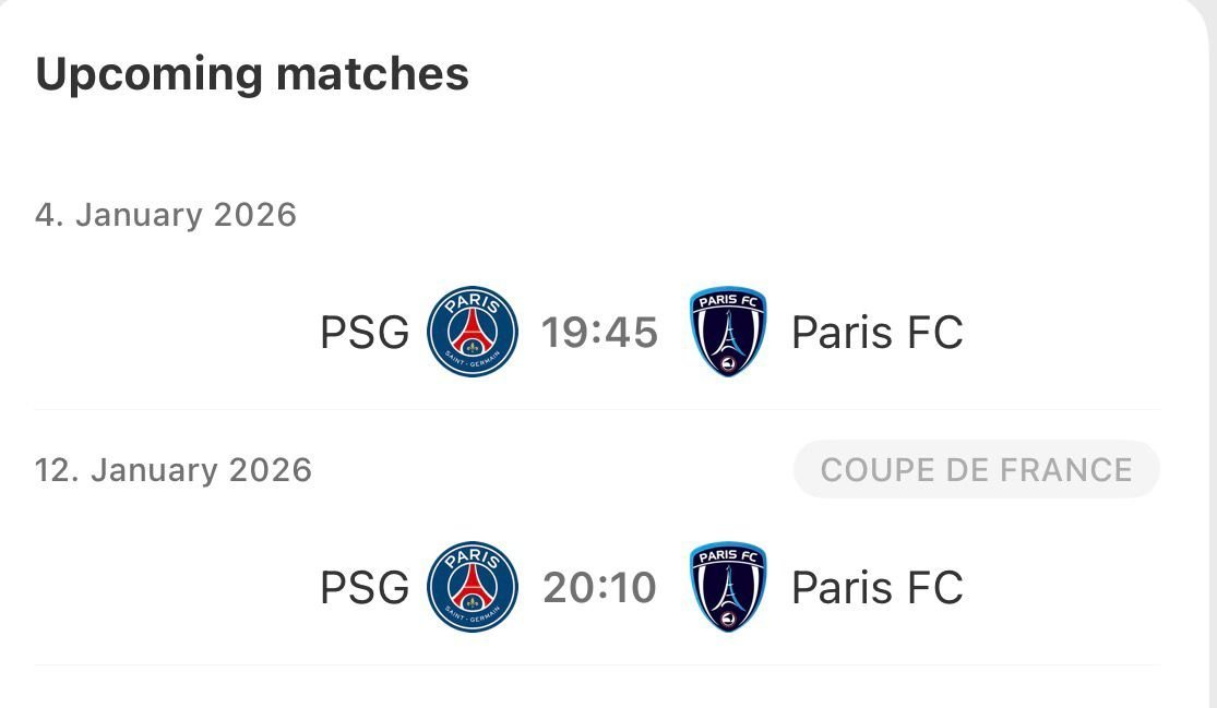 【一条街德比】基于法甲的赛程安排,以及法国杯32强战的抽签结果,巴黎市内的两支球队,将在1月份连续踢两场“同街德比”。巴黎FC,将在1月4日和12日,两次作客王子公园球场,对阵巴黎圣日耳曼。两支球队的主场,位于一条街道的两侧,仅仅相距44米。