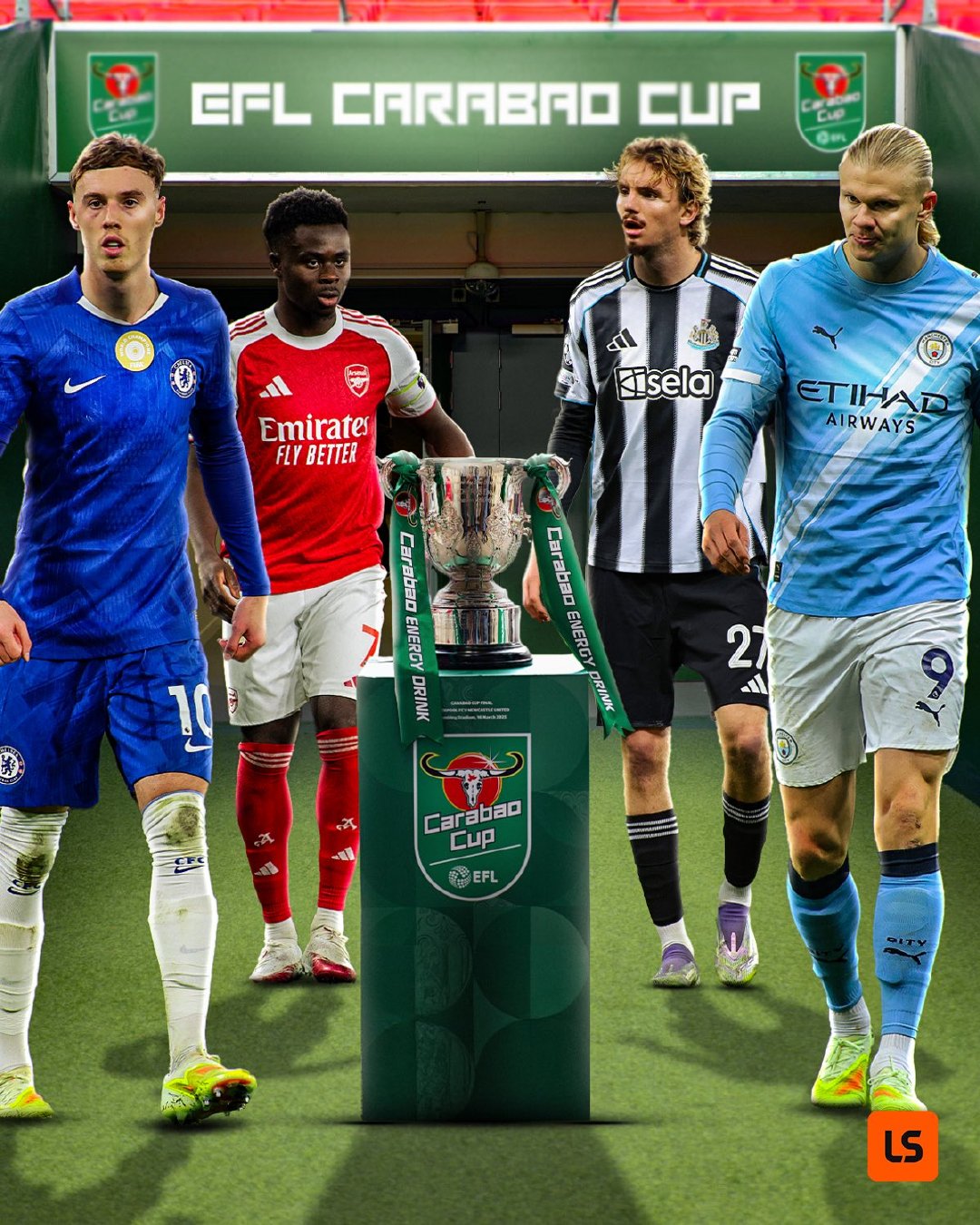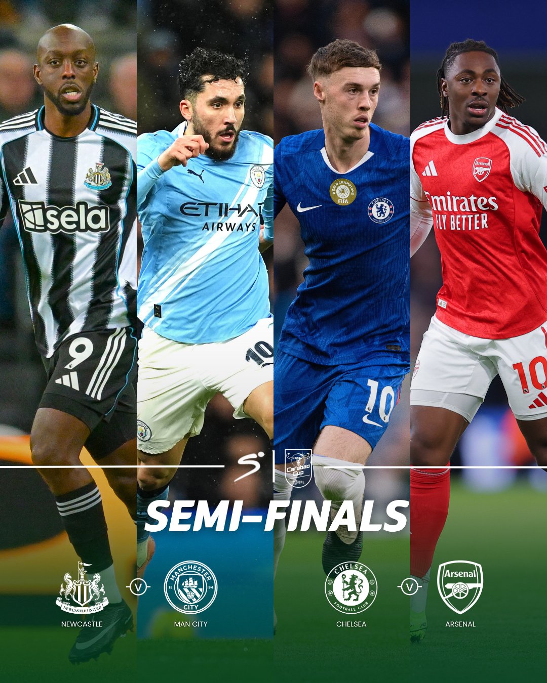 联赛杯四强对阵出炉 英格兰联赛杯半决赛,主客场两回合制,对阵和赛程正式出炉(前为主场,北京时间):首回合:纽卡斯尔联vs曼城,1月14日凌晨4点切尔西vs阿森纳,1月15日凌晨4点次回合:阿森纳vs切尔西,2月4日凌晨4点曼城vs纽卡斯尔联,2月5日凌晨4点