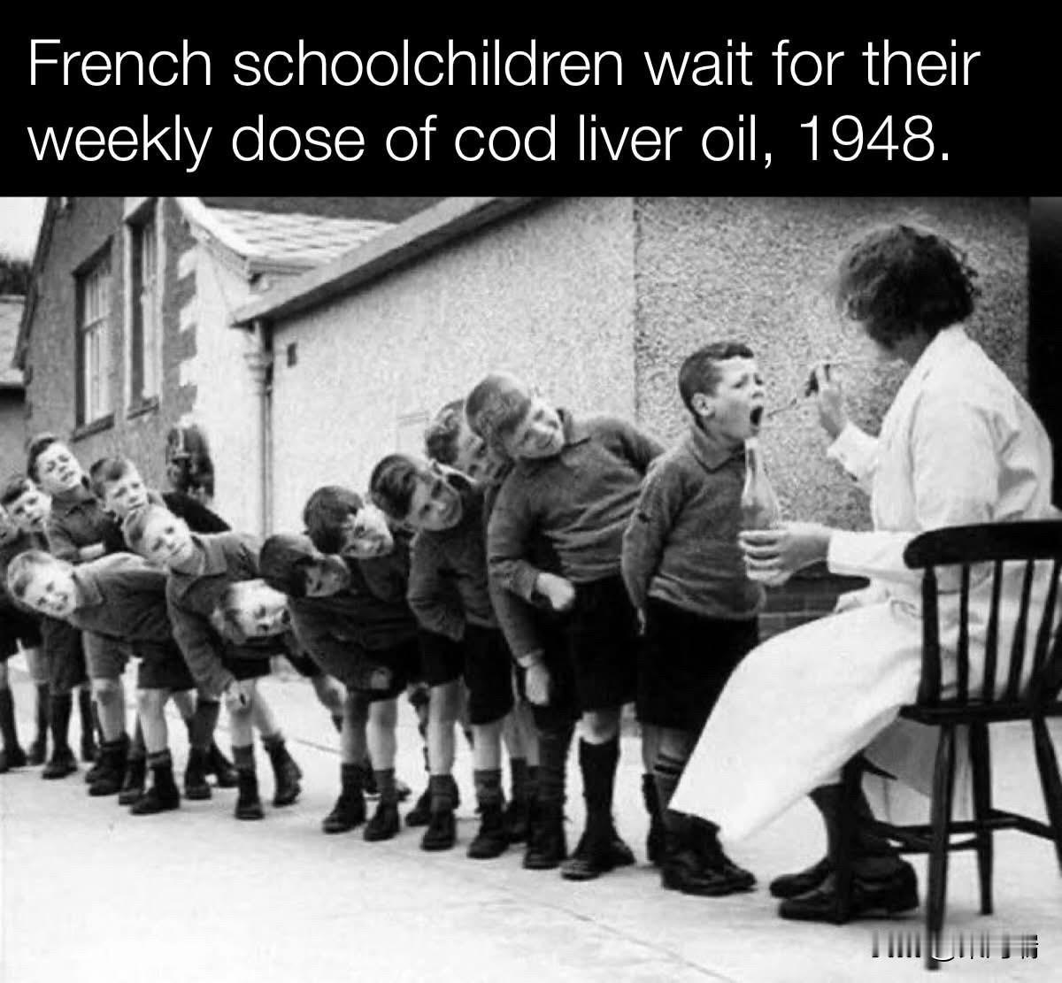 这张照片显示了1948年法国学童排队等待每周一次服用鱼肝油的情景。 二战结束后,欧洲普遍存在营养不良和食物短缺的问题。 鱼肝油富含维生素A和D,是当时重要的营养补充剂。服用鱼肝油对于儿童的生长、骨骼发育(预防佝偻病)和增强免疫系统至关重要。