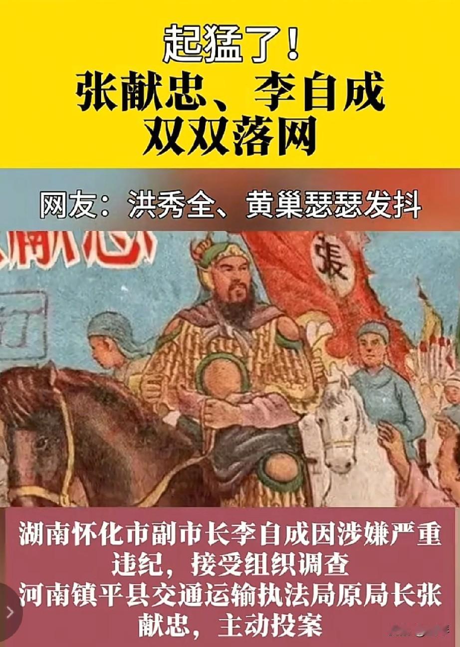 起猛了,一觉醒来,刷到李自成跟张献忠双双落网。[震惊][震惊][震惊] 哈哈哈,笑不活了,我还以为是网友穿越时空去逮了二位,没想到是当代两位同名同姓的贪官。咱就是说,你取啥名字不好?偏偏要跟历史人物重名?重名也就罢了,你还非要重两个造反派的名,这不是活该被抓吗?[呲牙][呲牙][呲牙]