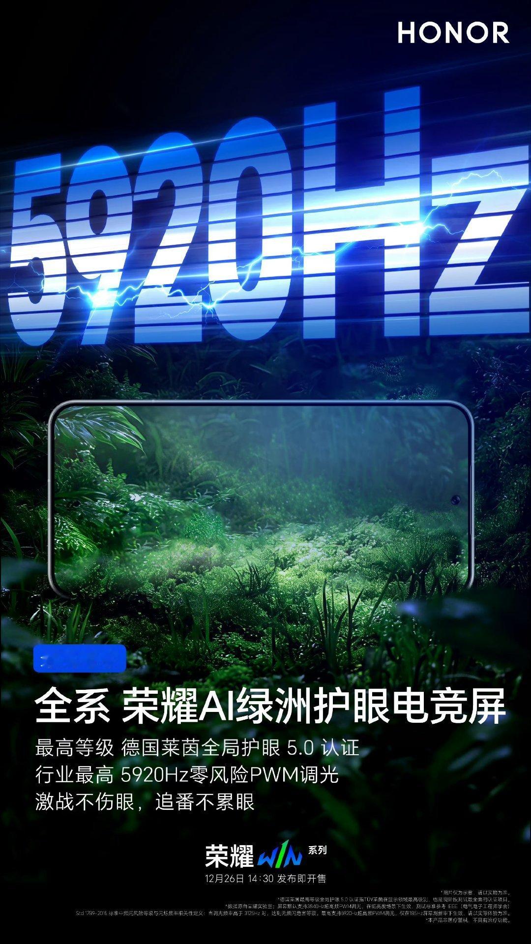 荣耀 WIN 全系 AI 绿洲护眼电竞屏,3D 游戏防眩晕,支持 5920Hz 零风险 PWM 调光,德国莱茵全局护眼 5.0 认证。