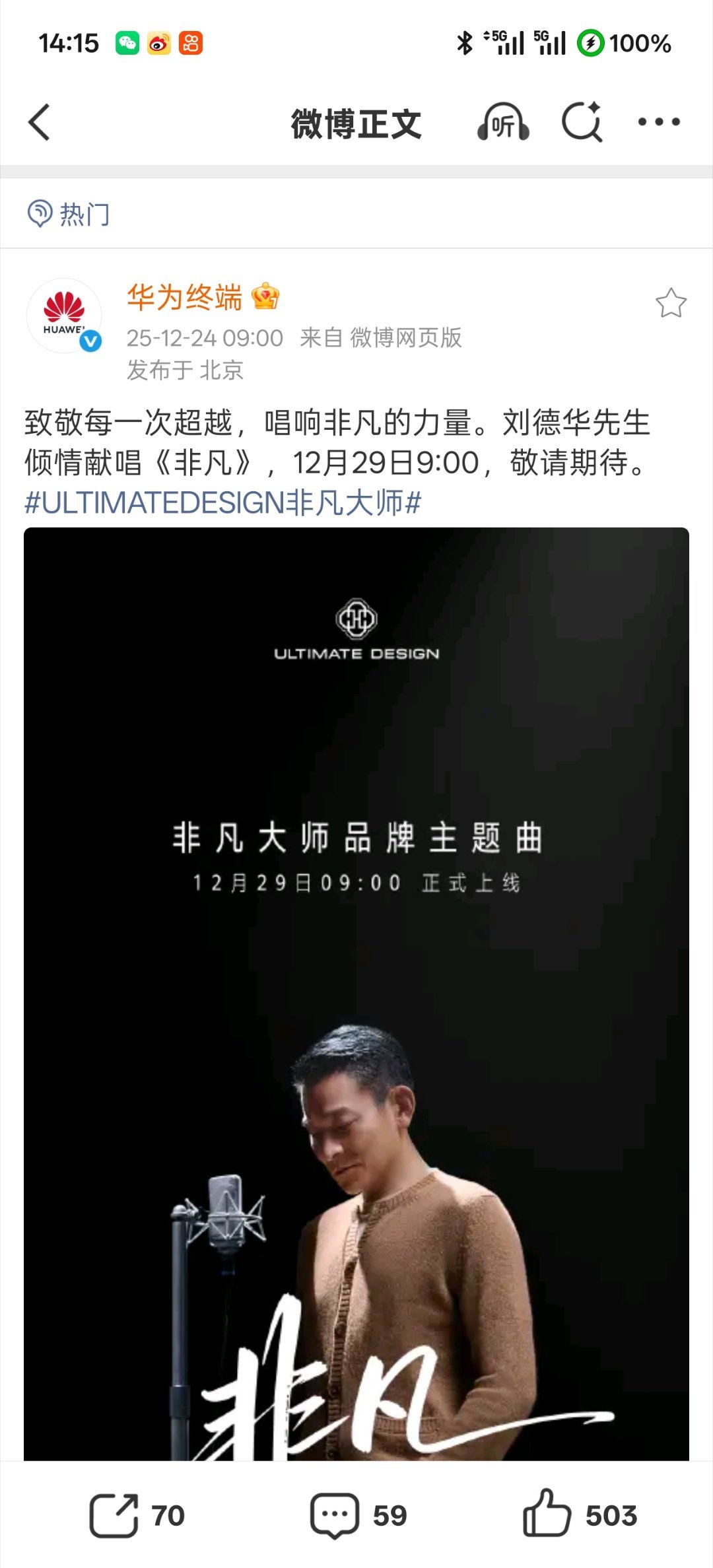 【华为非凡大师品牌主题曲定名《非凡》,确认由刘德华献唱】华为终端官方宣布,刘德华将献唱非凡大师品牌主题曲《非凡》,歌曲由蔡晓恩作曲、唐恬作词、郑楠制作。华为官方还发布了《非凡》的主题曲预告。华为非凡大师品牌主题曲将于 12 月 29 日 9:00 正式上线,宣称“以声音,致非凡”。2023 年 9 月,华为超高端品牌 ULTIMATE DESIGN 非凡大师发布,号称“极致美学、极致工艺、极致创新的集大成者”。值得一提的是,刘德华担任了华为 Mate 非凡大师品牌大使,并在发布会现场发表演讲《不是天生非凡,而是敢于非凡》。ULTIMATEDESIGN非凡大师