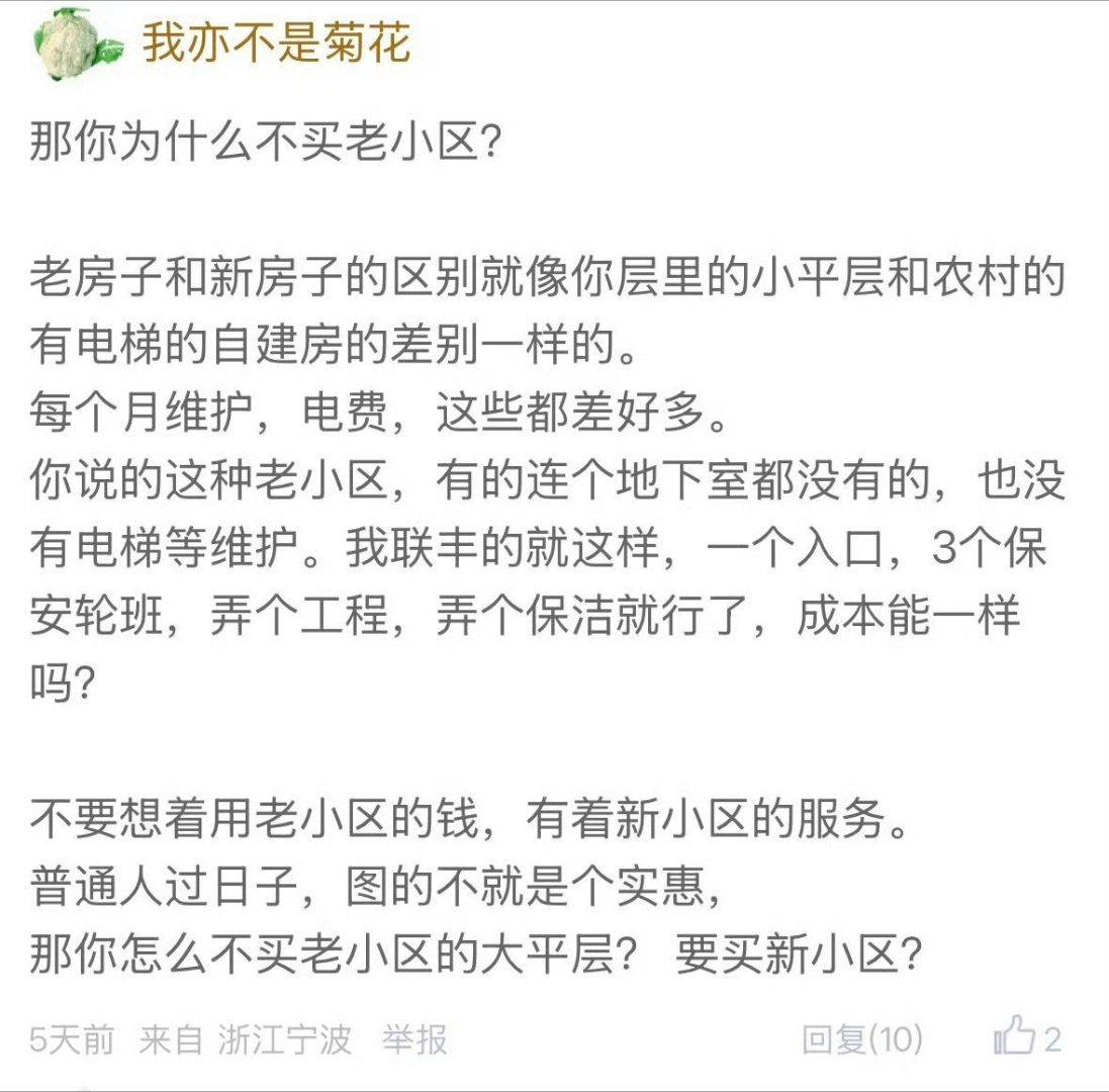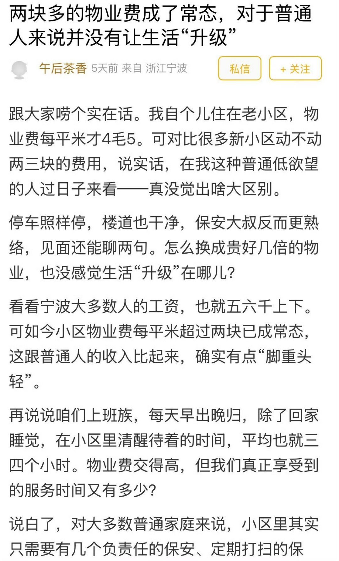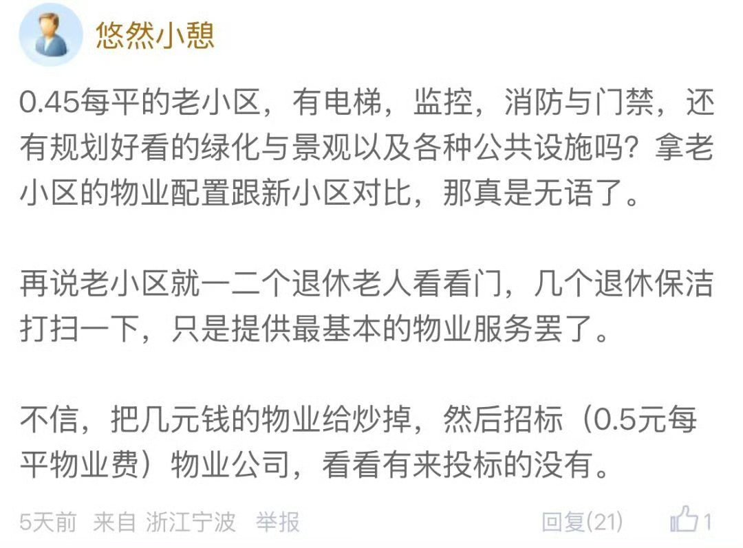 宁波业主吐槽4毛5物业费和两三块服务没差 ,你们先去物业费多少?宁波一业主称4毛5物业费和两三块服务“没差”网友将老小区与新小区物业费进行对比的想法,部分网友表示不敢苟同,有网友说:拿老小区的物业配置跟新小区对比,那真是无语了更有网友直言:物业费贵也有贵的道理。新小区的运营成本确实更高,不能想着用老小区的钱,买新小区的服务来源:东方热线同城热点创作计划