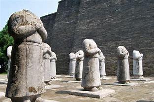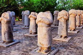 武则天墓前61个无头石人,千年来无法解释,却在1971年解开。 陕西乾县的黄土坡上,农民王老汉一锄头下去,"哐当"一声撞出个硬疙瘩。 扒开浮土细看,竟是颗雕刻精美的石人头颅,卷发深目,高鼻阔口,模样不像中原人。 更奇的是,这颗头颅脖颈处的断痕,恰好能对上乾陵朱雀门外那61尊无头石人的断裂处。 这些守在武则天墓前的石人,已经保持这种诡异姿态千年了。 他们穿着圆领袍服,腰间挂着鱼袋,双手拢在袖中作朝拜状,唯独齐刷刷没了脑袋。 当地老人说,这是"天谴",武则天称帝惹怒上苍,石像便遭了报应。 直到王老汉这一锄头,才让考古队重新盯上这些沉默的守护者。 文保专家把头颅捧在手里端详时,发现石像后脑勺刻着模糊的字迹。 清理拓片后,"波斯王卑路斯"几个字让全场倒吸凉气。 这位波斯萨珊王朝的末代王子,当年确实避难唐朝,还被唐高宗封为右武卫将军。 鱼袋上的鱼鳞纹路也印证了身份,唐代只有五品以上官员才能佩戴这种装鱼符的饰品。 顺着这个线索查下去,更多细节浮出水面。 20尊石像腰间的鱼袋分金、银两种材质,对应着不同官阶;有的石像衣襟上绣着联珠纹,那是波斯织物的典型纹样;还有尊石像残存的发式,与《新唐书》记载的突厥"椎髻"完全吻合。 这些发现拼凑出一幅盛唐外交图卷:来自波斯、吐火罗、突厥的61位藩属国首领,以石像形式永远守在陵前。 可脑袋去哪了?有人说是地震震掉的,但明嘉靖年间那场8级大地震,陵前的石狮石马都完好无损。 考古队在石像断裂处发现了整齐的凿痕,更像是人为切割。 翻《乾县文物志》才知道,民国初年就有盗墓贼专偷石刻头像,西安古玩市场曾出现过类似的唐代石人头颅,开价能抵十亩地。 最耐人寻味的是当地县志记载,明代有西域商人路过乾陵时,对着石像焚香叩拜。 结合"藩臣守陵"的传统,这些石像可能是唐代羁縻制度的活标本,朝廷册封当地首领,他们则以"守陵"名义表示臣服。 唐亡后,这些石像反而成了子孙的耻辱,被人悄悄凿去头颅也有可能。 如今,那尊刻着"波斯王卑路斯"的石像仍立在朱雀门外,断裂处的凿痕被风雨磨得模糊。 考古队用3D技术扫描了王老汉发现的头颅,数字模型里,深目高鼻的王子正凝视着千年后的天空。 这些没了脑袋的石像,倒比完整时更让人记住:大唐的包容,从来不是史书里的空话。
