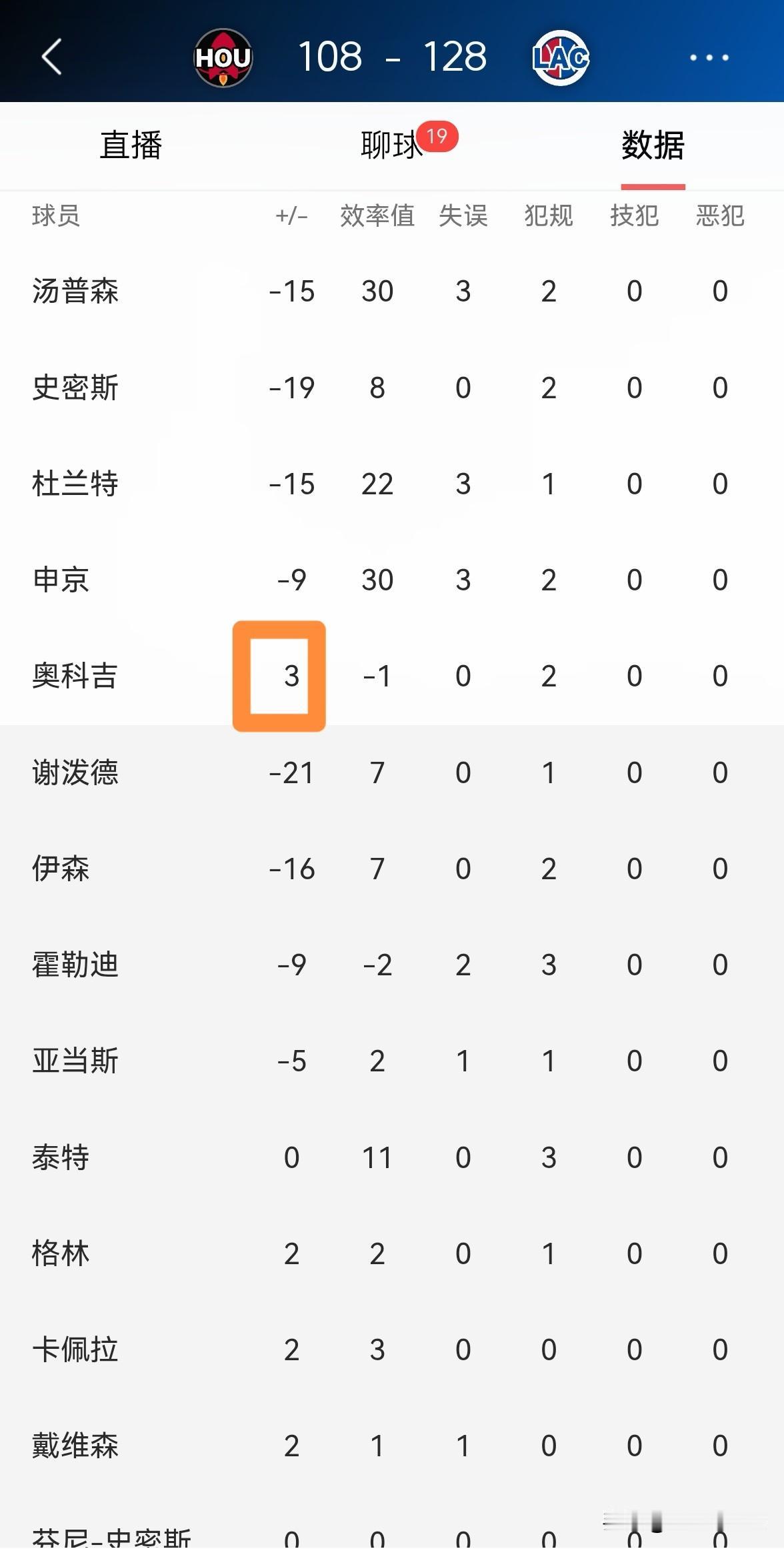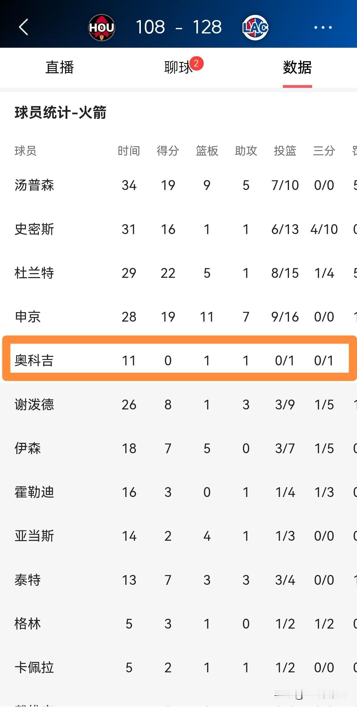 火箭大将奥科吉的出手次数真是太少了!在今天火箭客场以108:128惨败于快船的比赛中,奥科吉仅仅出手了1次,他的出手次数远远少于其他的首发球员。 全场比赛下来,奥科吉首发出战11分钟,投篮1中0没有得分,不过有1篮板1助攻,他的场上正负值为首发阵容里最高的+3。 如果奥科吉想要得到一份大合同,那么他必须增加自己的出手次数,尤其是在获得空位投篮时必须果断出手。
