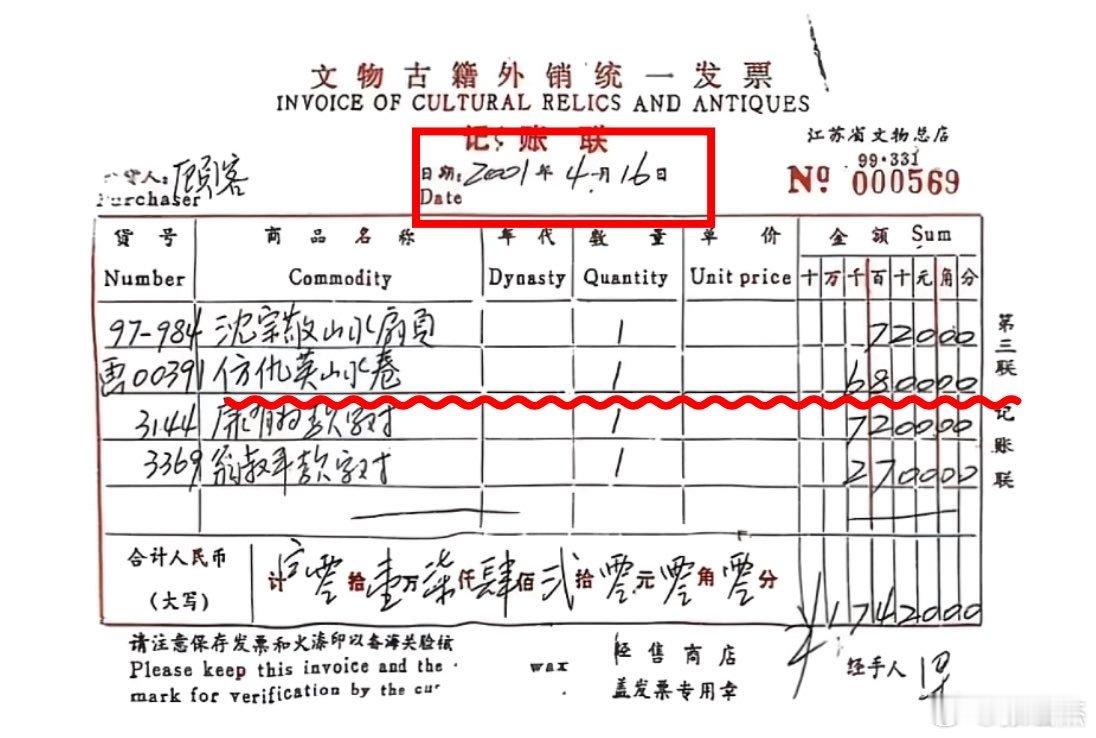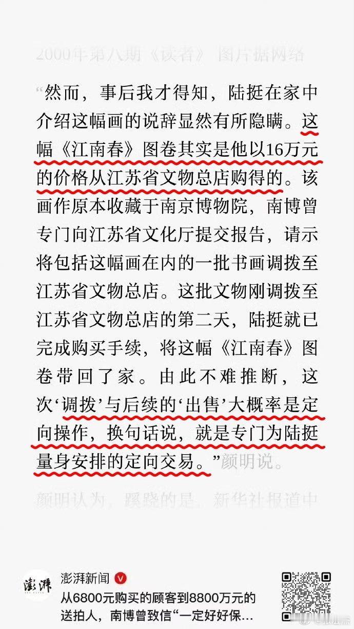 澎湃新闻:仇英的《江南春》是买家以16万元从文物总店购得,但几年后补开的发票只记账6800元。也就是说,有人私吞了153200元。