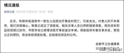 12月24日中午,合肥市卫健委发布了“情况通报”,称已对涉事医生停职处理,调查组将实事求是、依法依规、客观公正处理,事件的来龙去脉大概梳理一下, 1,10月27日孩子在合肥市妇幼保健院西区剖宫产出生 2,11月20日到该院新生儿科住院,接受蓝光治疗黄疸(不允许家属陪同,每周一/三/五电话告知孩子情况) 3,11月21日电话告知家属,孩子一切正常 4,11月22日下午6时,家属突然接到医院病危通知孩子肺出血。 5,家属到院后医生称,孩子病情罕见,血氨值高,凝血功能差,不清楚病因,建议立即转院。 6,11月24日,孩子在安徽省儿童医院被宣告死亡,接诊医生称孩子转过来时已瞳孔放大生命体征基本消失。 7,11月26日家属在警方介入下查看监控显示,11月22日17时50分,护士给孩子喂完奶粉将其侧放于床上后随即离开,离开后孩子自信蠕动至面部朝下姿势并开始挣扎,约13分钟后没了动静,18时34分被护士发现,进行抢救。 8,11月23日,家属委托合肥市医学会进行医疗事故鉴定。